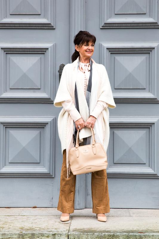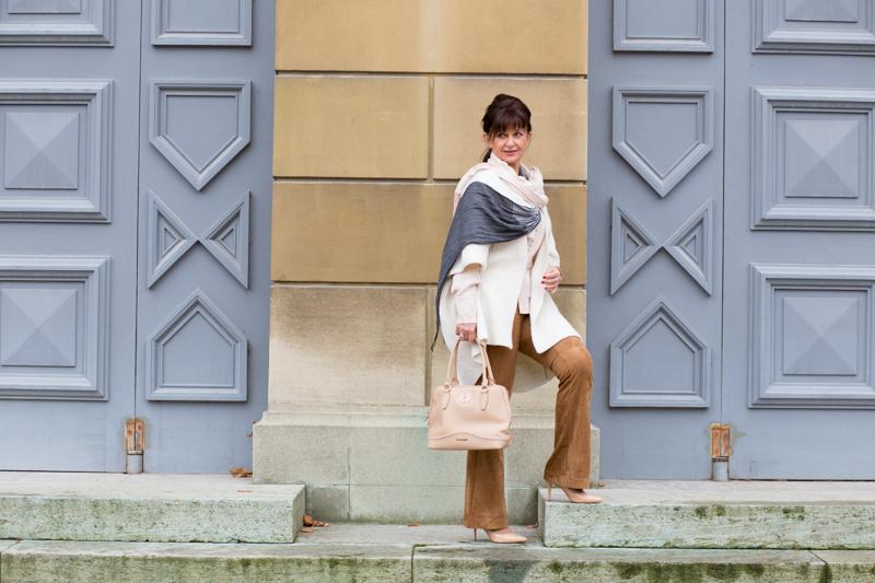 Das Winterwetter in München gleicht einem Herbsttag. Kein Schnee in Sicht. Die milde Temperatur erlaubt es, ohne dicke Daunenjacke durch die City zu gehen. Ich mache den Hofgarten heute zum Laufsteg. Helle Farben und coole Materialmixe aus Wolle, Seide und Leder erzeugen interessante Kontraste und setzen eine Lady 50plus perfekt in Szene.