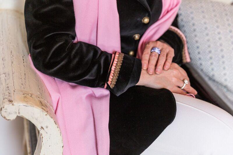 Mein It-Piece bei meiner heutigen Kombination ist der Gehrock aus Samt. Die zarten Applikationen in Rosetönen an den Ärmeln und im Taschenbereich, lassen den Gehrock feminin erscheinen. Hochwertige Knöpfe runden den edlen Stil des Samtgehrocks ab.