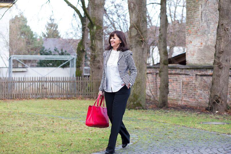 Ich habe mich heute auf meinem Post für den Business Look mit Hahnentritt entschieden, der mich bei vielen Meetings und Schulungen schon begleitet hat. Weiße Bluse von Zara, schwarze Hose von Laurel und der Blazer ist von Escada. Mit dieser Kombination fühle ich mich auch nach langen Terminen immer richtig gekleidet.