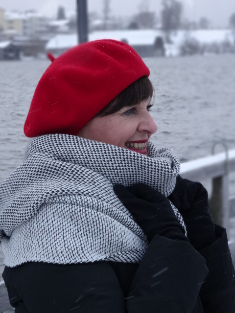 Mein rotes Barett kombiniere ich gerne zu meinem schwarzen Mantel und dem schwarz-weißen Kuschelschal. Rot ist für mich eine Farbe, die in vielen Kombinationen bei mir vorkommt. Selbst den Lippenstift habe ich passend dazu ausgewählt – ist es Euch aufgefallen?