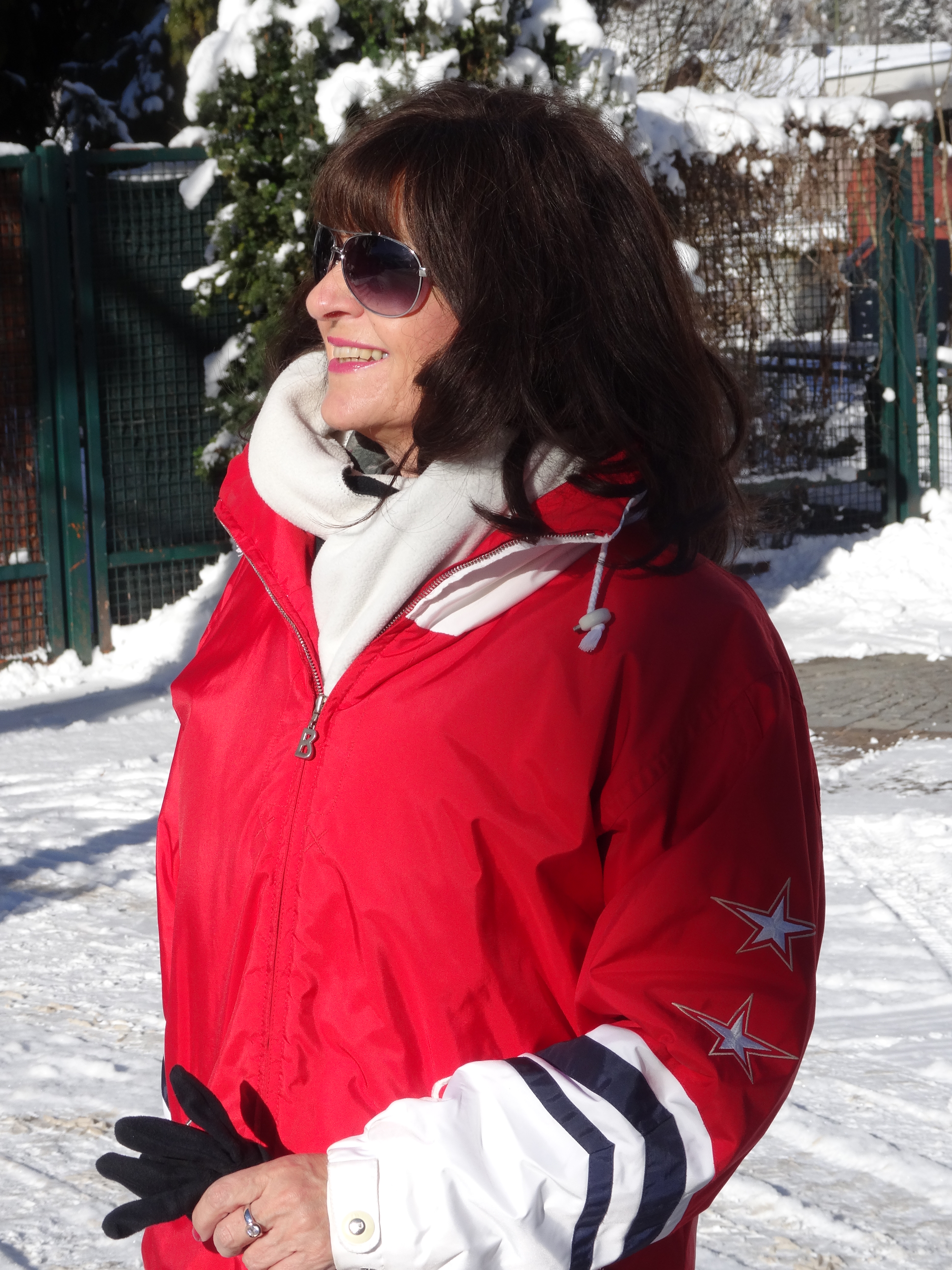 Mir sind Farben immer wichtig. Zum wunderschönen Schnee finde ich die rote Winterjacke einen speziellen Hingucker. Als reduzierte Begleiter habe ich Accessoires in schwarz gewählt, wie zum Beispiel der Schal und meine Handschuhe.