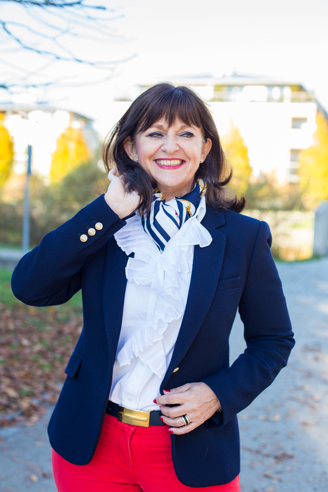 Unter den Blazer würde ich ein schönes Tuch oder eine weiße Bluse anziehen.