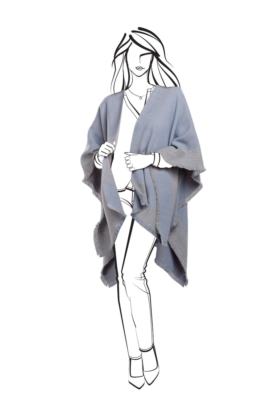 Ein Cape oder Poncho gehört seit vielen Jahren zu meiner Garderobe. Er wurde in der letzten Saison zum IT-Piece erkoren. Ein Cape ist für jeden Look ein Hingucker. Lässiger als ein Mantel, komfortabel für die kalten Sommerabende, cool für den Bürolook. Falls Du noch immer kein Cape oder Poncho haben solltest, probiere es aus. Besonders die blau-graue Farbigkeit des Capes aus der Helene Fischer Kollektion ist farblich eine gute Wahl.