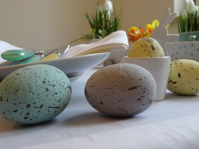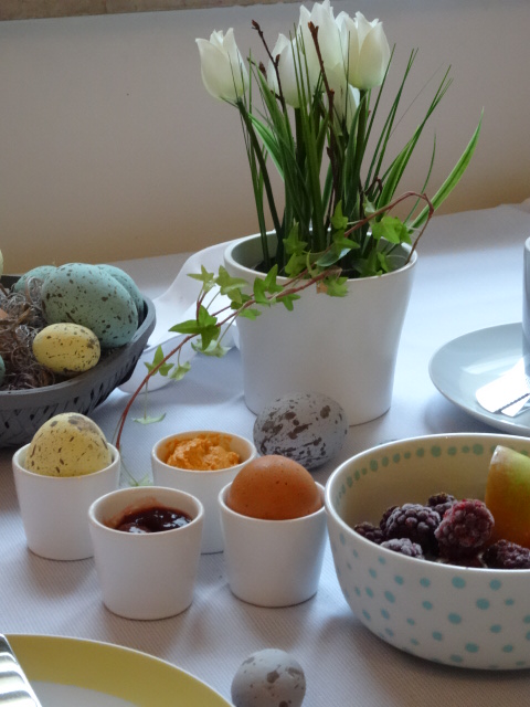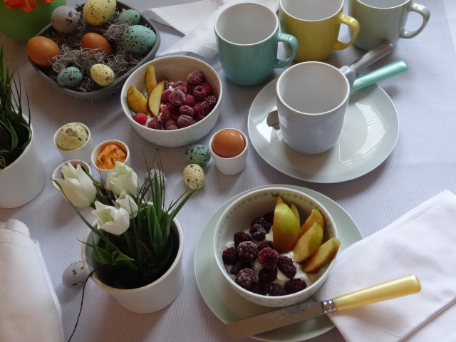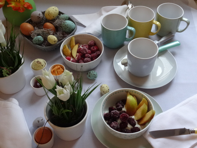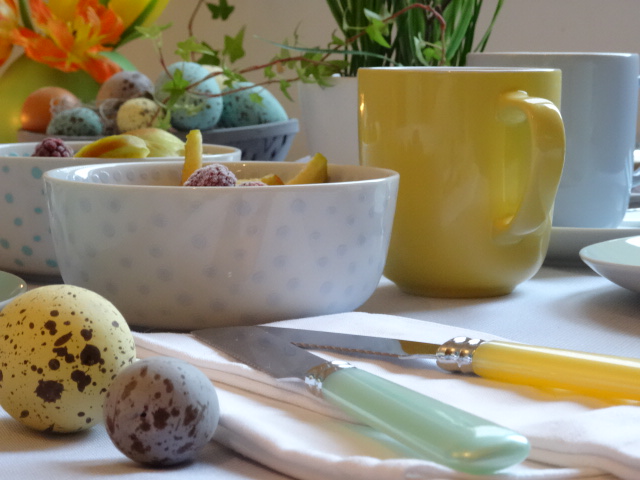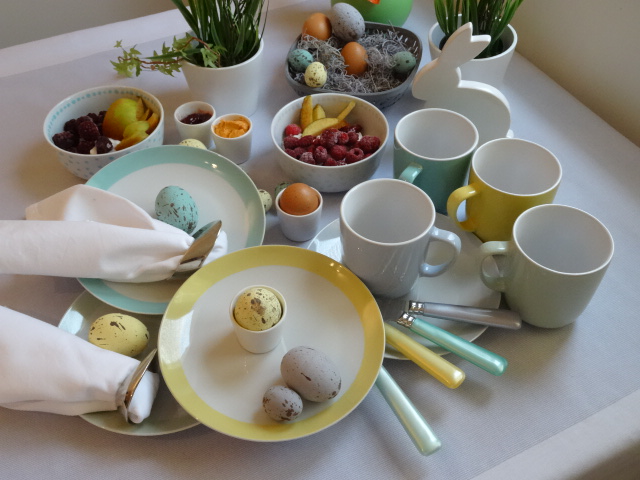 Mein neues, farbenfrohes Geschirr besteht aus großen Tassen, dazu habe ich die farblich passenden kleine Teller entschieden und getupften Müslischalen. Bei Tchibo gab es sogar die passenden Ostereier, die ich alle Jahre wieder benutzen kann. Die farbenfrohen Frühstückmesser sind bestens geeignet, das frische knackige Brötchen, die leckeren Croissant und das Baquette mit Oliven auszuschneiden. Außerdem bringen meine Mädels immer ein richtig knackiges Brot aus Franken mit – mmmmhhhhh, ich bekomme direkt Appetit. Habt Ihr auch schon den Geruch von frischen Brötchen und duftendem Brot in der Nase?