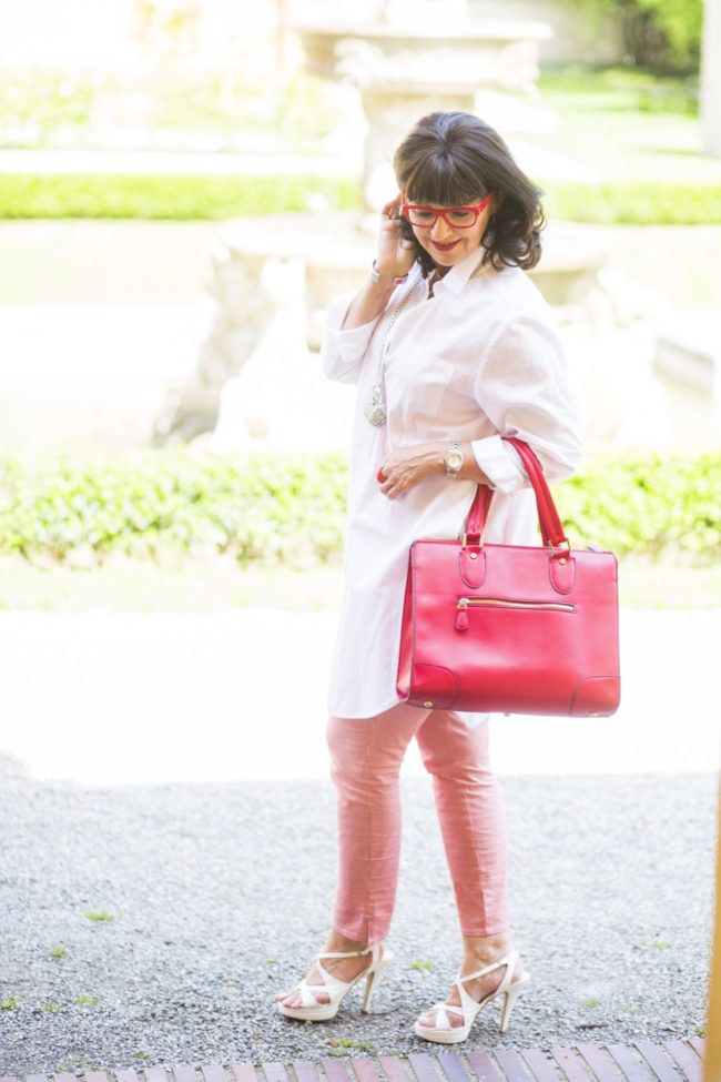 Ein durchstruktuierter Business Tag steht im Kalender. Da heißt es sowohl gut zu Fuß unterwegs, aber auch stilvoll gekleidet zu sein. Damit ich den ganzen Tag den Durchblick behalte, greife ich gerne zur roten Brille. Der Maritime Look ist für mich immer eine sichere Wahl. Abends ist im Anschluss ein Geschäftsessen geplant. Schnell die flachen Schuhe gegen High Heels eintauschen und ohne großen Aufwand ist der Look zum Abendlook abgewandelt. Meine silberfarbige Clutch liegt im Auto zum Austausch ebenfalls bereit.