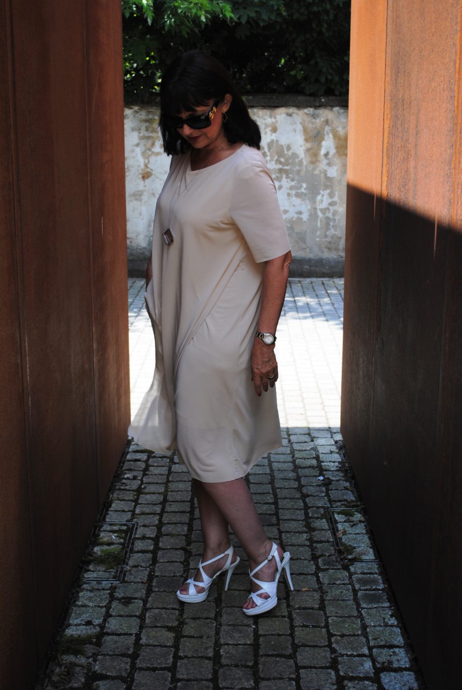 Farblich bin ich mit Nude ziemlich zurückhaltend, entgegen meiner Kleidung, die sonst bei mir im Kleiderschrank zu finden ist. Als Kontrast zum monochromen Kleid habe ich mich für eine auffällige Sonnenbrille entschieden. Normalerweise trage ich auf Fotos keine Sonnenbrille. Aber heute war es mir einfach nach einem komplett anderen Look. Es ist immer wichtig, dass wir uns als Lady jenseits der 30 ab und zu von einer anderen Seite zeigen sollten.