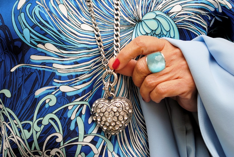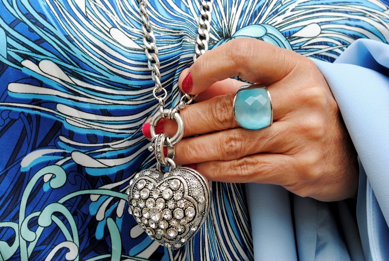 Mein großer türkisfarbiger Ring, meine lange Kette mit dem auffälligen strassbesetztem Herz kann ich für viele andere Outfits genauso gut verwenden, wie für meinen heutigen Ton-in-Ton-Look. Beim Accessoires-Kauf solltest Du darauf achten, dass sie zu vielen anderen Stilrichtungen in Deinem Kleiderschrank kombinierbar sind.