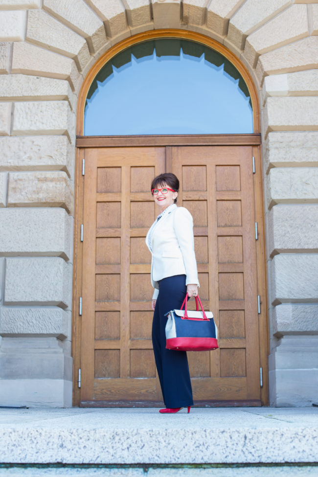 Dass ein Kundentermin im BUSINESS LOOK stattfindet, auch bei sommerlichen Temperaturen, ist für mich selbstverständlich. Meine Wahl für mein Outfit fällt dabei auf meine marinefarbige Hose und meinen weißen Blazer. Ein kleiner Farbklecks sind meine roten Schuhe.
