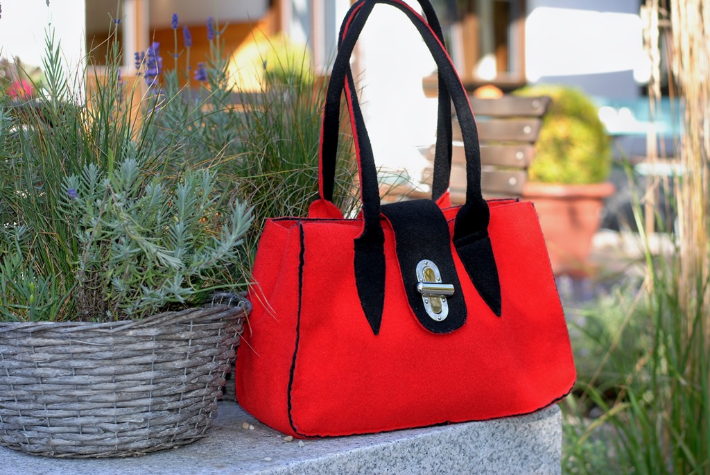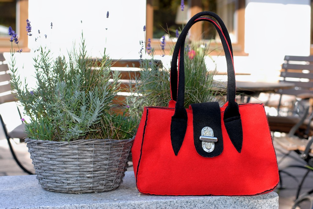 Ich habe mich bei meinem Styling für die Filztasche entschieden. Gerade wenn es voll und eng wird auf einem Fest, ist Filz ein unkompliziertes Material. Falls mal etwas darüber geschüttet wird, hält Filz das besser aus, als jede Ledertasche. Die rot-schwarze Filztasche passt perfekt zu meinem farblich abgestimmten Dirndl. Aber auch zur Jeans mit rotem Blazer kam sie schon zum Einsatz bei mir.