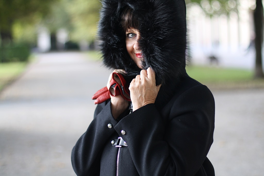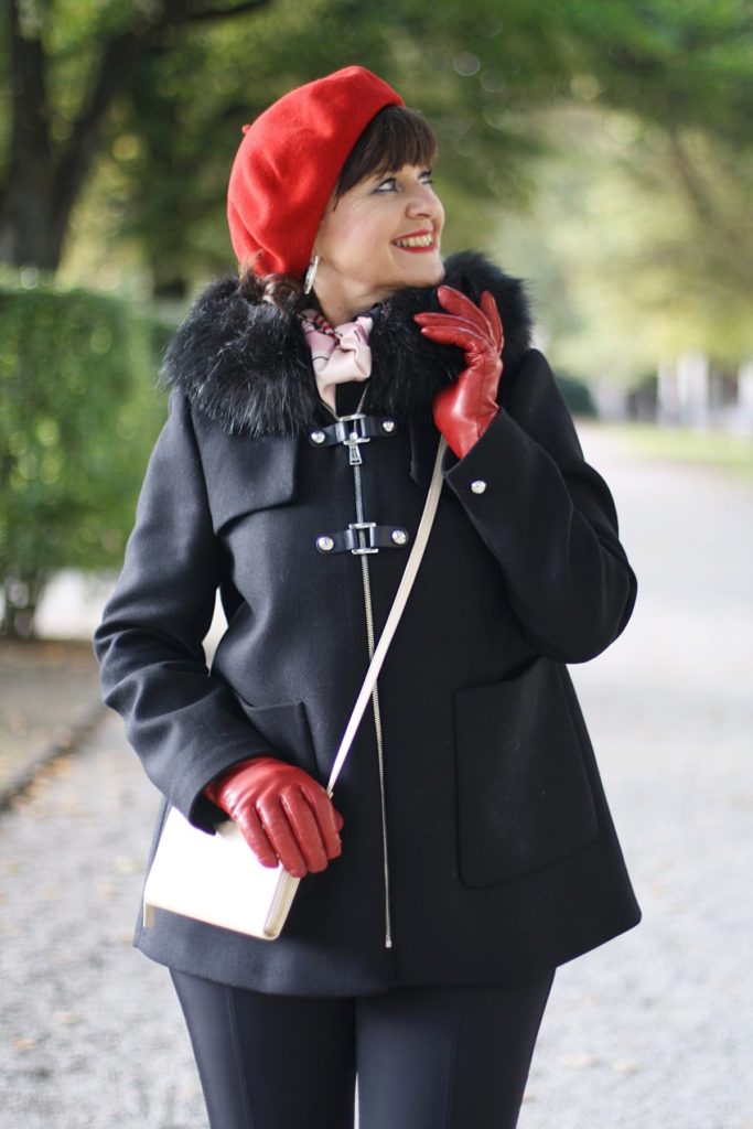 Heute bin ich – fast – im Komplettlook SCHWARZ unterwegs. Nun ja, nicht ganz. Ein bisschen Rot darf auf gar keinen Fall fehlen. Mit meiner roten Mütze und meinen roten Handschuhen setze ich Akzente, die sicherlich gleich ins Auge fallen. Der Schal spiegelt die Farben in zarten Rottönen zusätzlich wider.