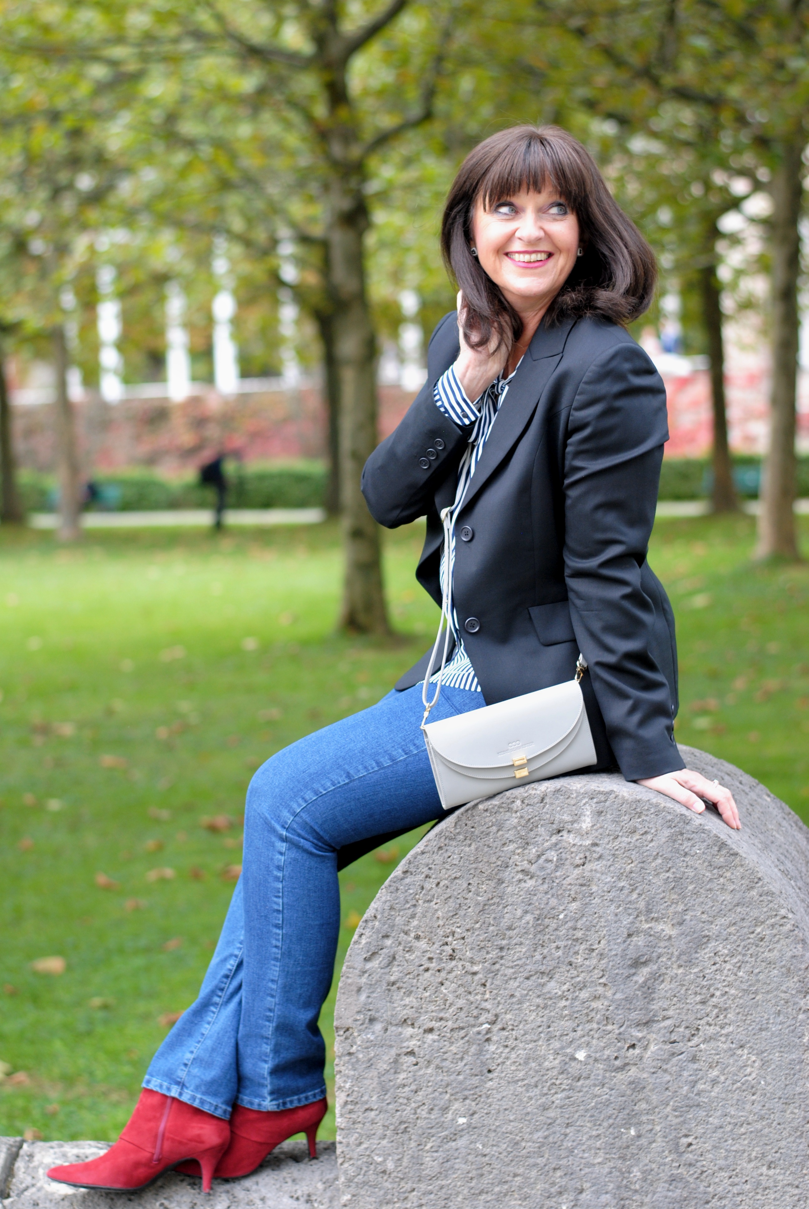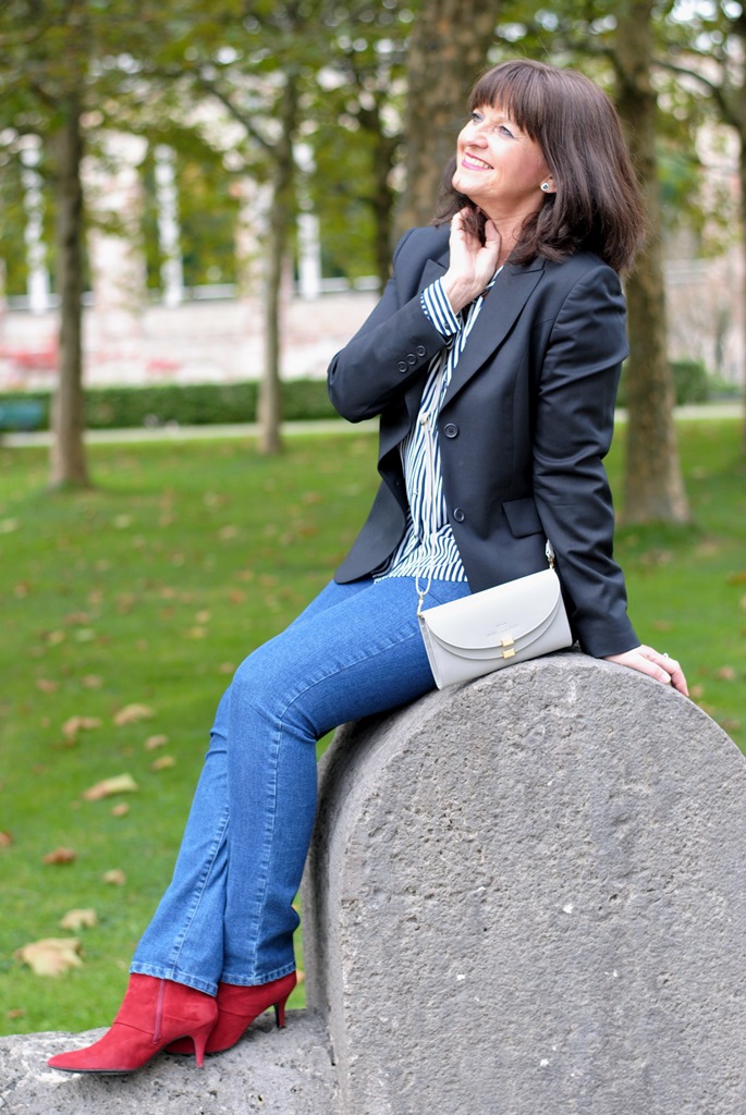 Der marinefarbige Blazer ist der Allrounder unter den Blazern. Ich kombiniere ihn mit meiner Jeans und einem dunkelblauen Schluppenbluse mit weißen Streifen. Dieser elegante Blazer gehört zu einem meiner Business-Kostüme. Aber den Blazer nur als Gesamt-Look Kostüm zu tragen, dafür ist er mir zu wertvoll. Er würde zu selten zum Einsatz kommen.