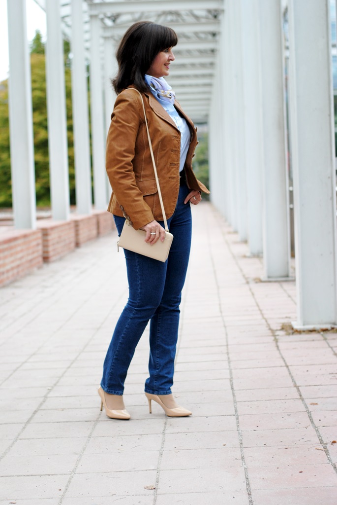 Heute geht es etwas gemütlicher zu. Büroarbeit, Seminarvorbereitungen, Erledigungen stehen auf dem Plan. Bequeme Kleidung spielt dabei eine große Rolle. Bequem heißt aber nicht Jogginganzug – nein, da halte ich mich an Herrn Lagerfeld. Jeans mit Strechtanteil ist dabei enorm wichtig. Mit einer wunderschönen hellblauen Bluse kombiniere ich gerne meine Kleidung, wenn die Tage düster sind. Mein Lederblazer ist ein Allrounder und passt hervorragend zu meinem heutigen sportiven klassischen Stil.
