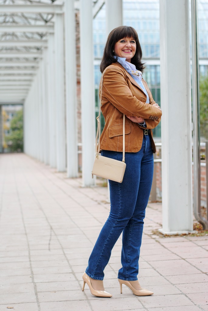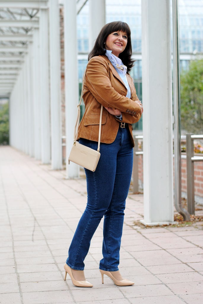 Heute geht es etwas gemütlicher zu. Büroarbeit, Seminarvorbereitungen, Erledigungen stehen auf dem Plan. Bequeme Kleidung spielt dabei eine große Rolle. Bequem heißt aber nicht Jogginganzug – nein, da halte ich mich an Herrn Lagerfeld. Jeans mit Strechtanteil ist dabei enorm wichtig. Mit einer wunderschönen hellblauen Bluse kombiniere ich gerne meine Kleidung, wenn die Tage düster sind. Mein Lederblazer ist ein Allrounder und passt hervorragend zu meinem heutigen sportiven klassischen Stil.
