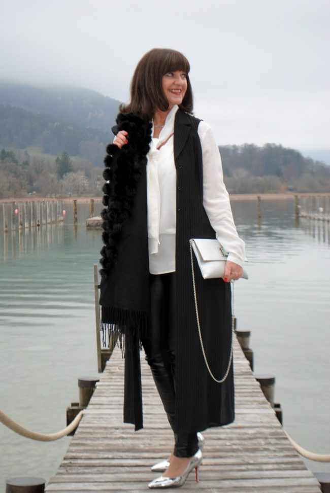 das ist ein tolles Outfit. Wie immer gefallen mir besonders die silberfarbenen Accessoires, die den schwarz-weiß Look festlich aufwerten, ohne dass es zu überladen wirkt.