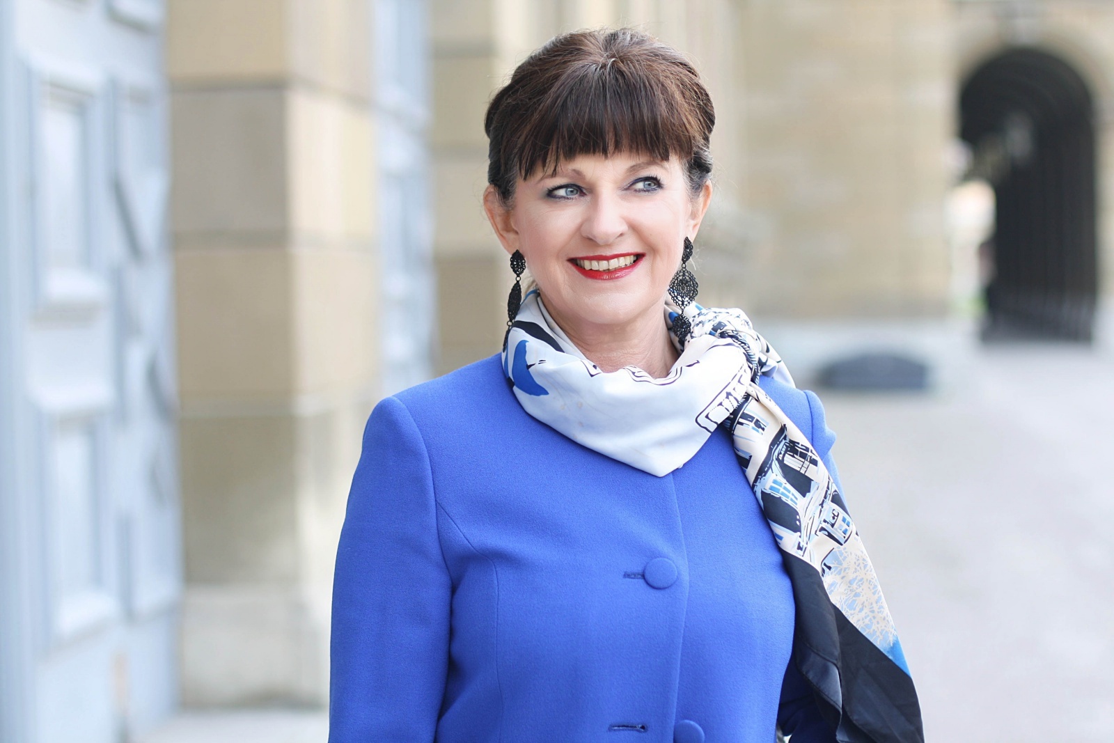 Ich mag es gerne farbig! Die Woche soll wettertechnisch extreme Unterschiede aufweisen – mal Schnee, mal Sonne, mal Regen. Es gibt viele Anlässe und Termine, wo der perfekte Business-Look von mir gefordert wird. Mein gerade geschnittenes KLEID in royalblau ist als farblicher Hingucker für Geschäftstermin oder ein Beratungsgespräch optimal. Dazu der passende Gehrock und es kann los gehen. Seriös und edel – das ist mein heutiger Stil. Und nie vergessen: Mit einem passenden Tuch bekommt jeder Look den persönlichen Touch.