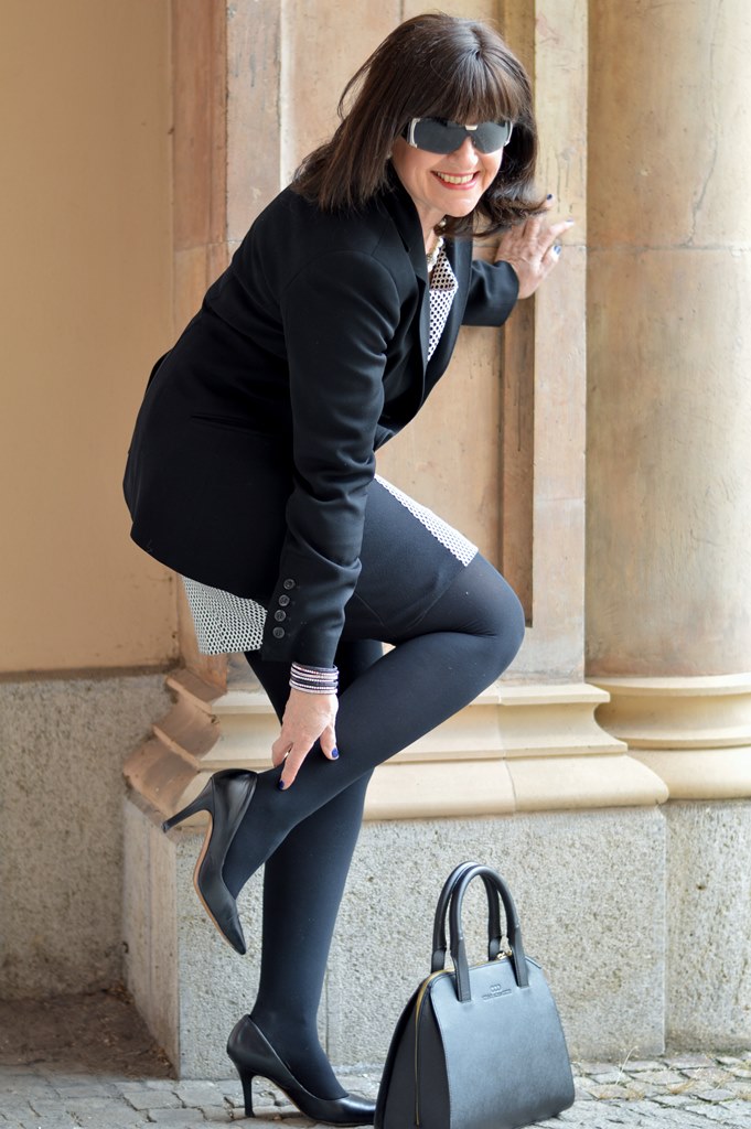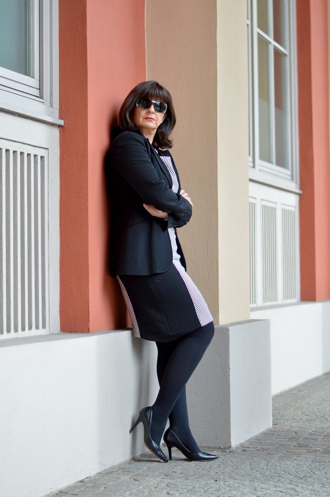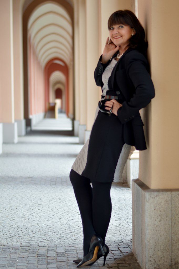 Meine Etuikleid von COMMA, im Schwarz-Weiß-Look habe ich seit drei Jahren. Die zeitlose elegante Form unterstreicht zusätzlich die optimale Passform. Seitliche Kontrasteinsätze sind für meinen Figurtyp vorteilhaft.