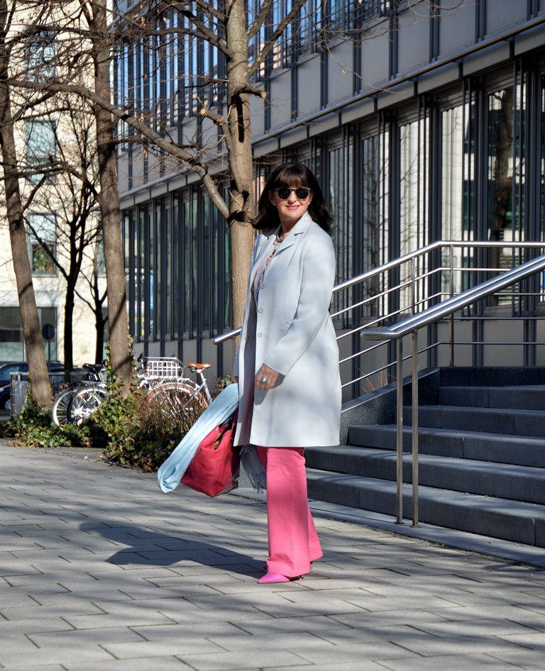 Toll siehst Du aus. Der hellblaue Mantel steht Dir ausgesprochen gut. Ich liebäugel ja auch schon eine Weile mit einem hellblauen Kurzmantel. Mal sehen, ob mir so ein chicer Mantel über den Weg läuft. Hellblau hat nämlich vor kurzem mein Modeherz erobert. Die pinke Hose dazu finde ich auch richtig klasse. Pink kannst Du prima tragen. Mit so einem Outfit läutest Du definitiv den Frühling ein.