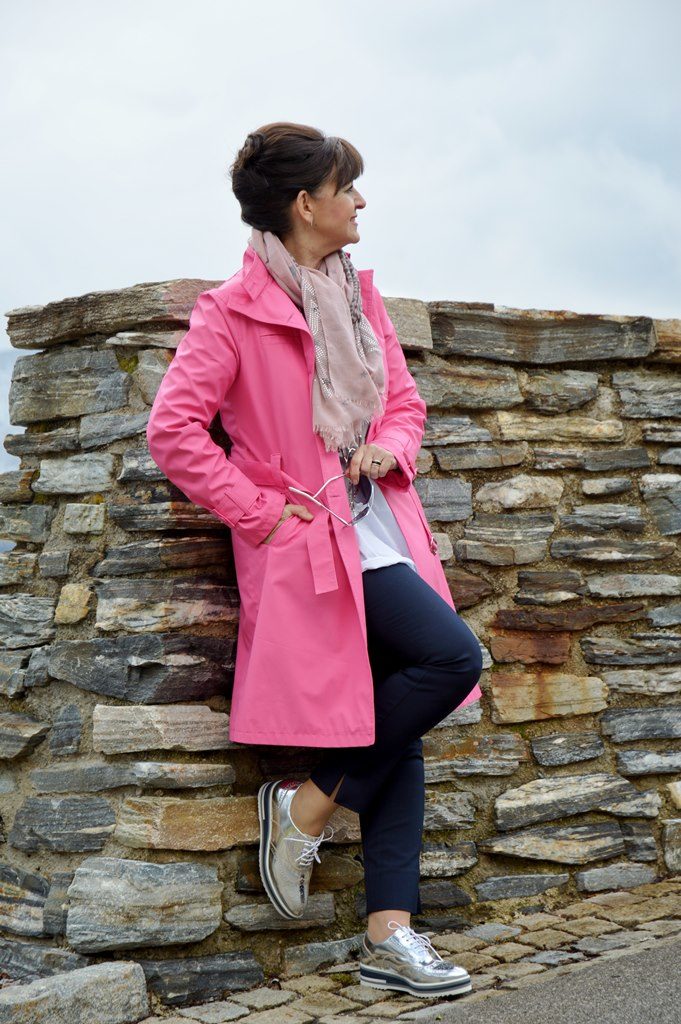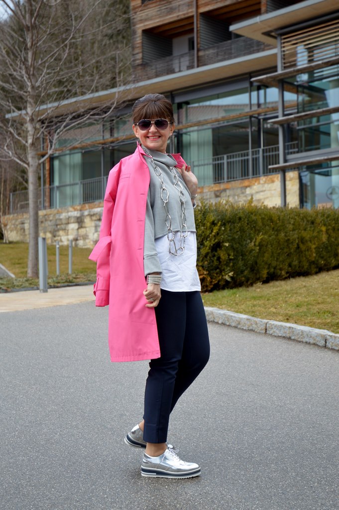 Der Reise-Look ist dir mal wieder absolut gut gelungen, steht dir ausgezeichnet! Für mich kann ich mir dieses Outfit auch sehr gut vorstellen, denn sowohl dunkelblaue Hose, und Oberteil als auch die Schuhe sind in meiner Farbskala als Sommertyp enthalten. Obwohl ich mit „Knall-Farben“ vorsichtig sein sollte, finde ich den Pink-Trenchmantel auch ganz toll. Es ist inzwischen zum Ritual geworden, dass ich jeden