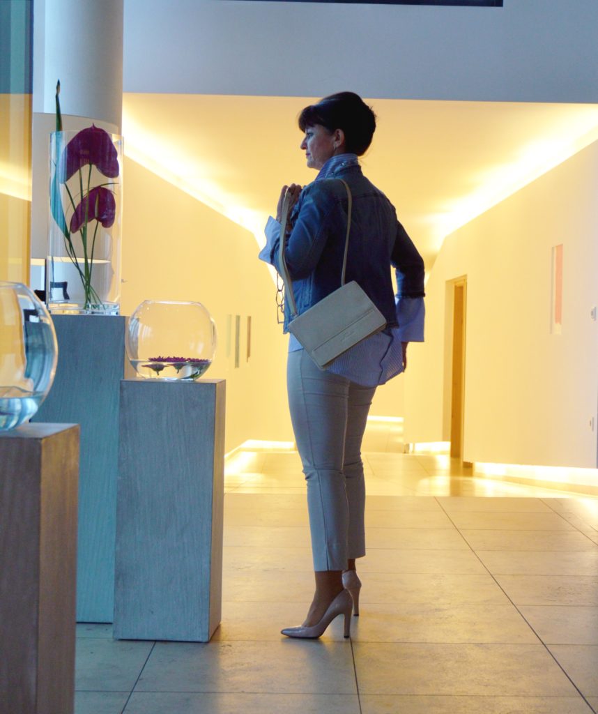Dein Outfit sieht wieder richtig toll aus! Und alles „meine Farben“. Ich habe jahrelang keine Jeans angezogen, auch nicht in der Freizeit, jetzt habe ich mir zwei gekauft, eine etwas hellere und eine dunkle, auf einmal finde ich sie gut. Die Schuhe dazu passen auch ideal dazu, leider kann ich nicht so gut auf High Heels laufen, deshalb ziehe ich sie nicht so oft an.