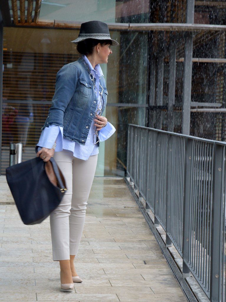 Meine Kombination besteht aus drei Basisteilen, die ich an unterschiedlichen Orten zu verschiedenen Zeiten gekauft habe. Die Bluse mit den extrem langen Armen habe ich im letzten Jahr in Meran gekauft. Bisher hatte ich die Bluse sehr selten getragen. Aber zu meiner Jeansjacke mit den 3/4 Ärmeln finde ich die Kombination perfekt.