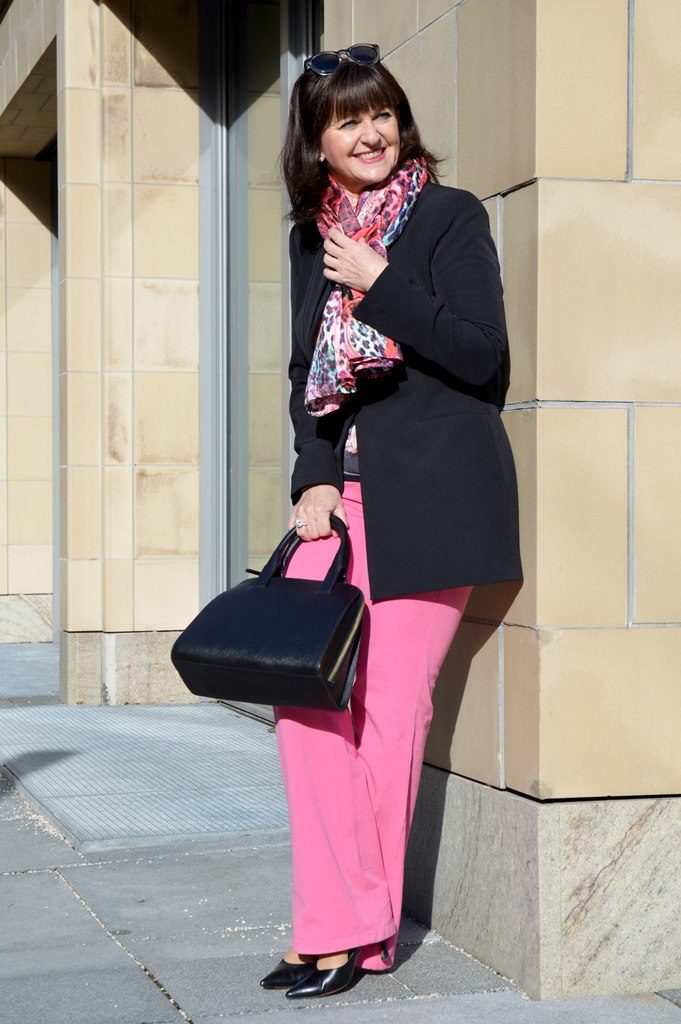 Treffen mit einem neuen Geschäftspartner ist meine heutige Planung. Für dieses Meeting habe ich mich für einen schwarzen Longblazer und einer farblich trendigen pinkfarbigen Hose entschieden. Als Eyecatcher wähle ich einen langen Schal. Durch den Printdruck in den Farben von Hose und Blazer spiegeln sich die Hauptfarben wider. Ich liebe Tücher und Schals.