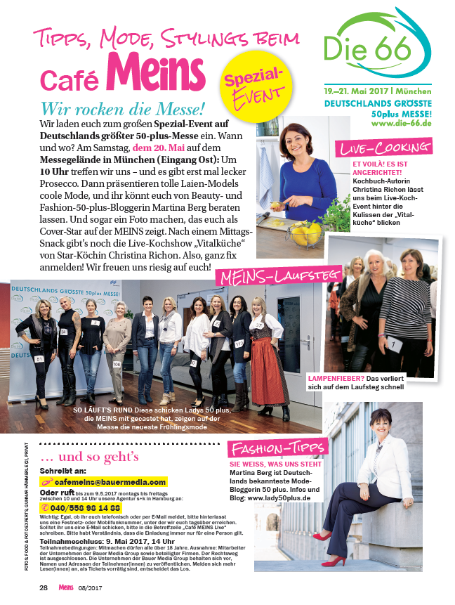 In diesem Jahr bin ich wieder LIVE auf der „Die 66“ dabei! Und zwar LIVE auf der Showbühne! Gemeinsam mit der Zeitschrift „MEINS“ rocken wir die Messe! WOW – was habe ich mich darüber gefreut, als die Redaktion an mich herangetreten ist. Als langjährige bekannte Stil-Expertin ist es mir eine besondere Ehre live vor Ort zu sein und zahlreiche Tipps in Sachen Stil und Outfit zu präsentieren.
