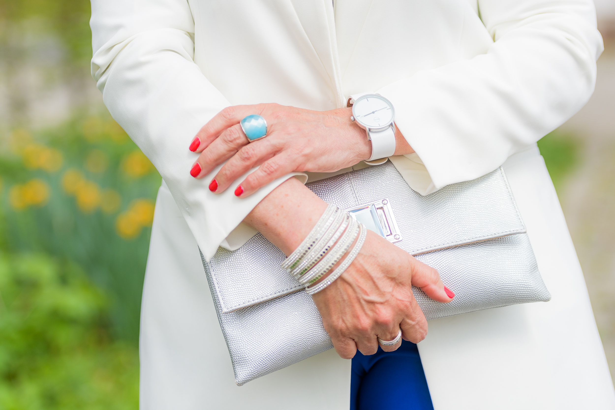 Für meinen heutigen Look habe ich mir zwei Styling Tipps in Sachen Accessoires einfallen lassen. Zum einen mit einer kleinen silberfarbigen Clutch. Bevorzugt für den edlen Auftritt am Abend, als Gast bei der standesamtlichen Trauung oder für den Theaterbesuch.