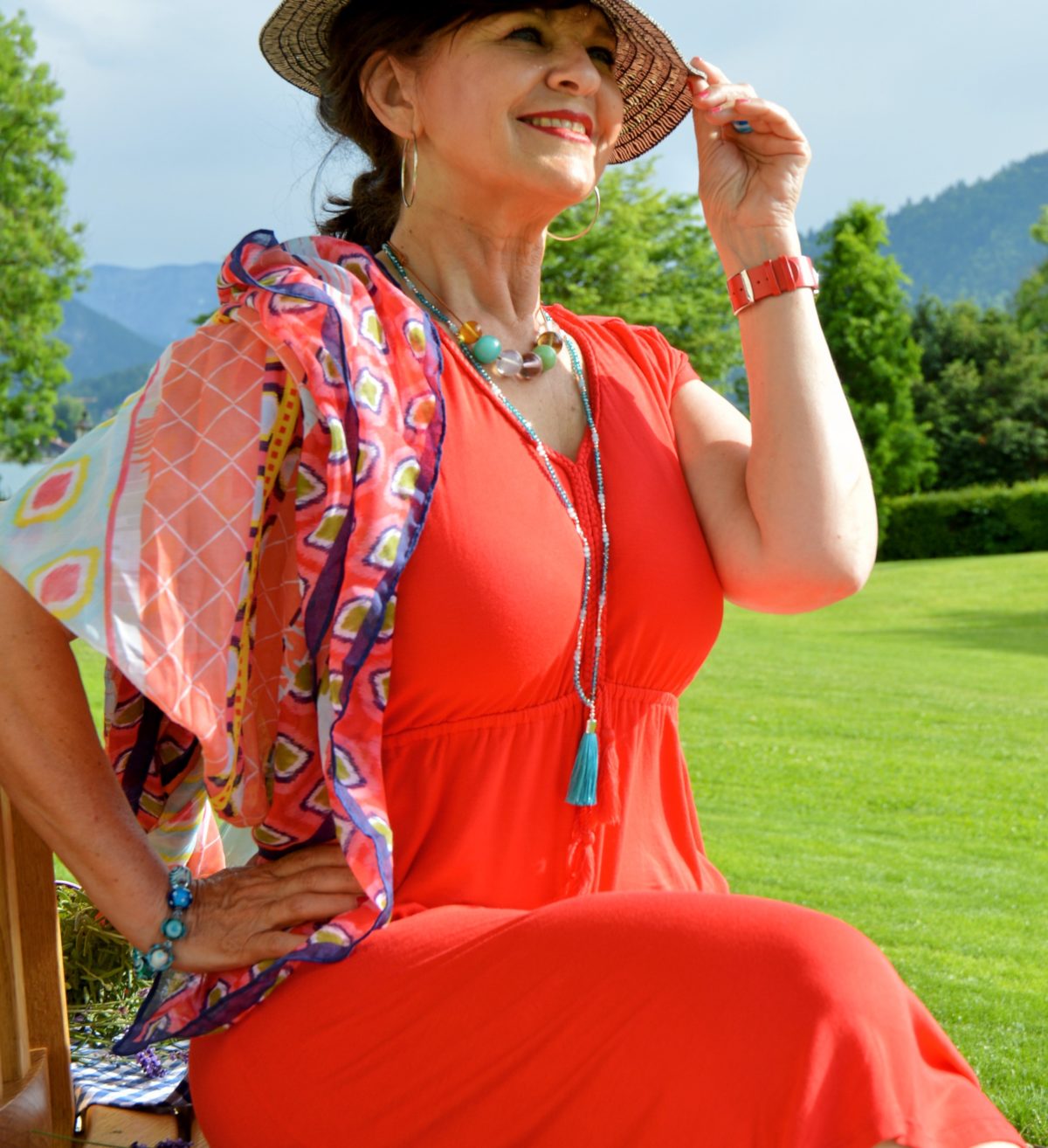 Ich habe gar keine spezielle Farbe für den Sommer. Ich mag auch alle kräftigen Farben. In Pastellfarben sehe ich eher blass aus. Ich mag auch gemusterte Oberteile sehr, allerdings wird es dann schwierig mit mehrfarbigen Tüchern oder bunten Ketten. Da hat man mit einfarbigen Oberteilen mehr Möglichkeiten.