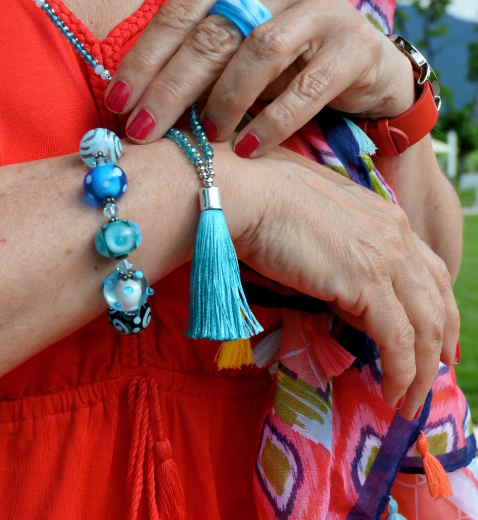 das Armband ist aus handgeblasenen Glasperlen, die ich selbst hergestellt habe. Es ist zwar nicht aus der aktuellen Melanie Moertel-Kollektion, aber guck Dich gerne mal auf meiner Webseite um: http://www.melaniemoertel.com