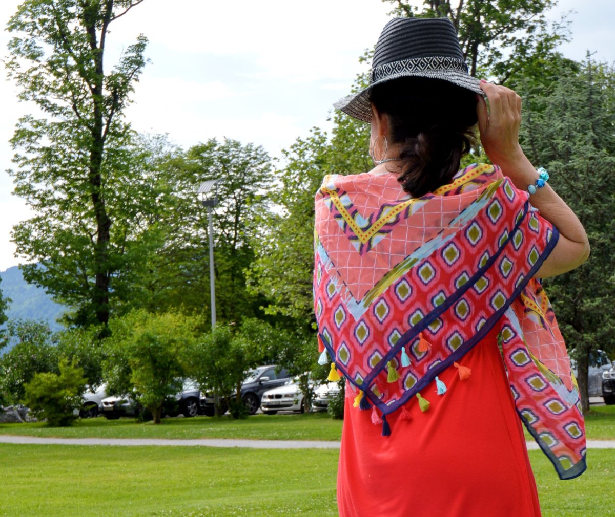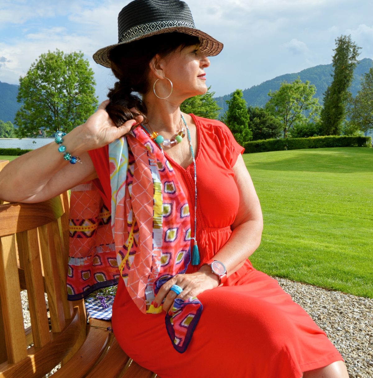 Das rote Kleid steht Dir ausgesprochen gut. Außerdem mag ich Rot an Dir auch gerne leiden. Das bunte Tuch finde ich ebenfalls klasse. Aber auch die Kulisse ist so schön. Da bekommt man richtig Lust auf Urlaub.