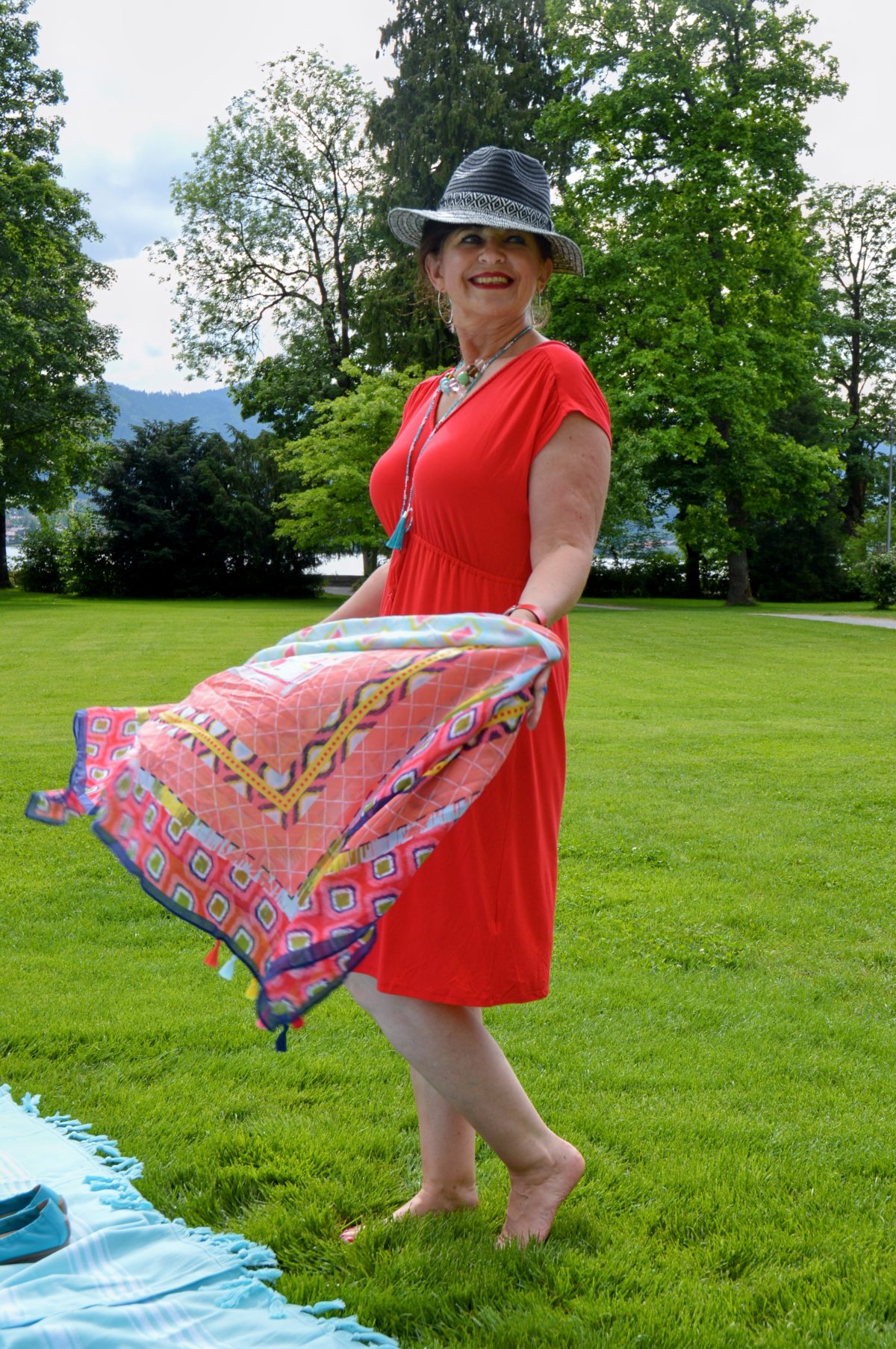 Das rote Kleid steht Dir ausgesprochen gut. Außerdem mag ich Rot an Dir auch gerne leiden. Das bunte Tuch finde ich ebenfalls klasse. Aber auch die Kulisse ist so schön. Da bekommt man richtig Lust auf Urlaub.