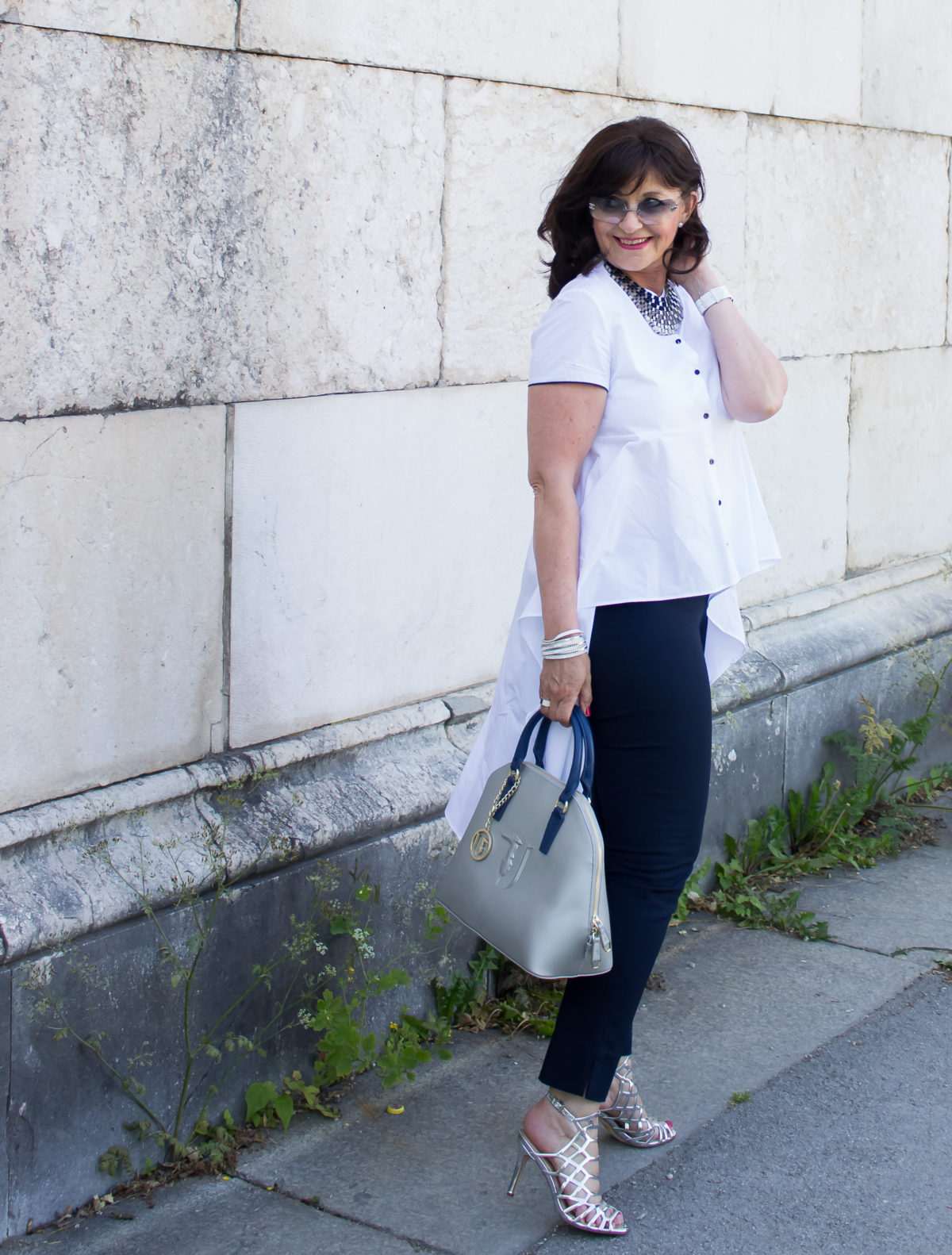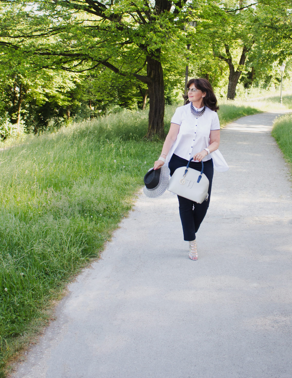 Mein Outfit spiegelt diese duftige Zeit wieder. Es ist ganz leicht, sich morgens für einen Look zu entschieden. Alles was für meine heutige Garderobe benötige, ist eine extravagante Bluse und angesagte metallic Accessoires. Natürlich die marinefarbige Hose nicht zu vergessen. WEISS ist eines der Farben, die ich im Sommer bevorzugt trage. Für weiße Blusen schlägt mein Herz zu allen Jahreszeiten.