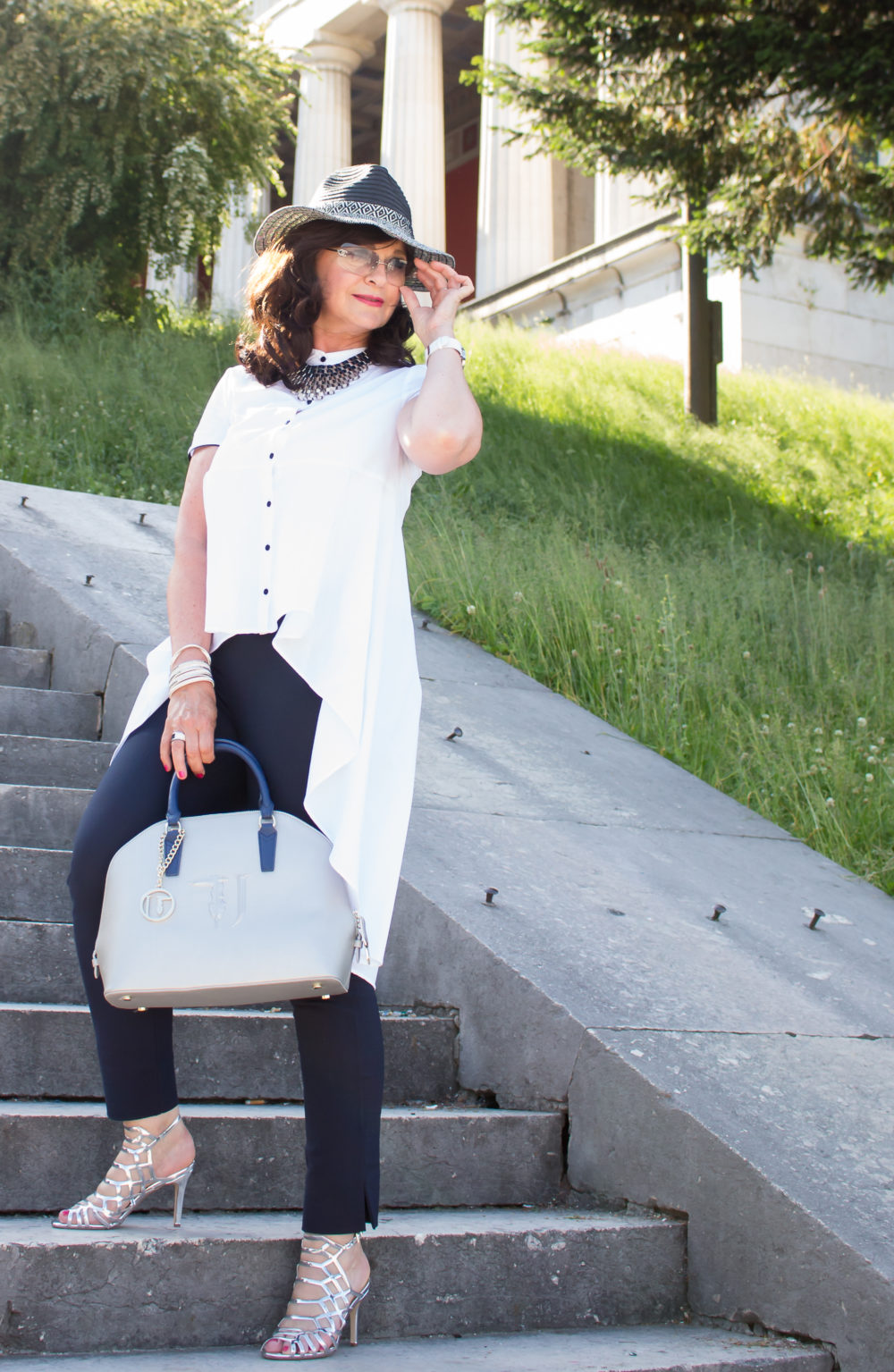 Ja, das ist „mein Look“! Fantastisch! Die Bluse gefällt mir außerordentlich gut, die verschiedenen Längen sind raffiniert und eine blaue Hose habe ich auch im Schrank. Die Tasche – die fehlt mir noch! Sehr, sehr schön! Einmal noch die Schuhe erwähnen: Finde ich auch richtig passend und sehr schön! Dieses Outfit kann man leicht nachstylen. Überaus gelungen!