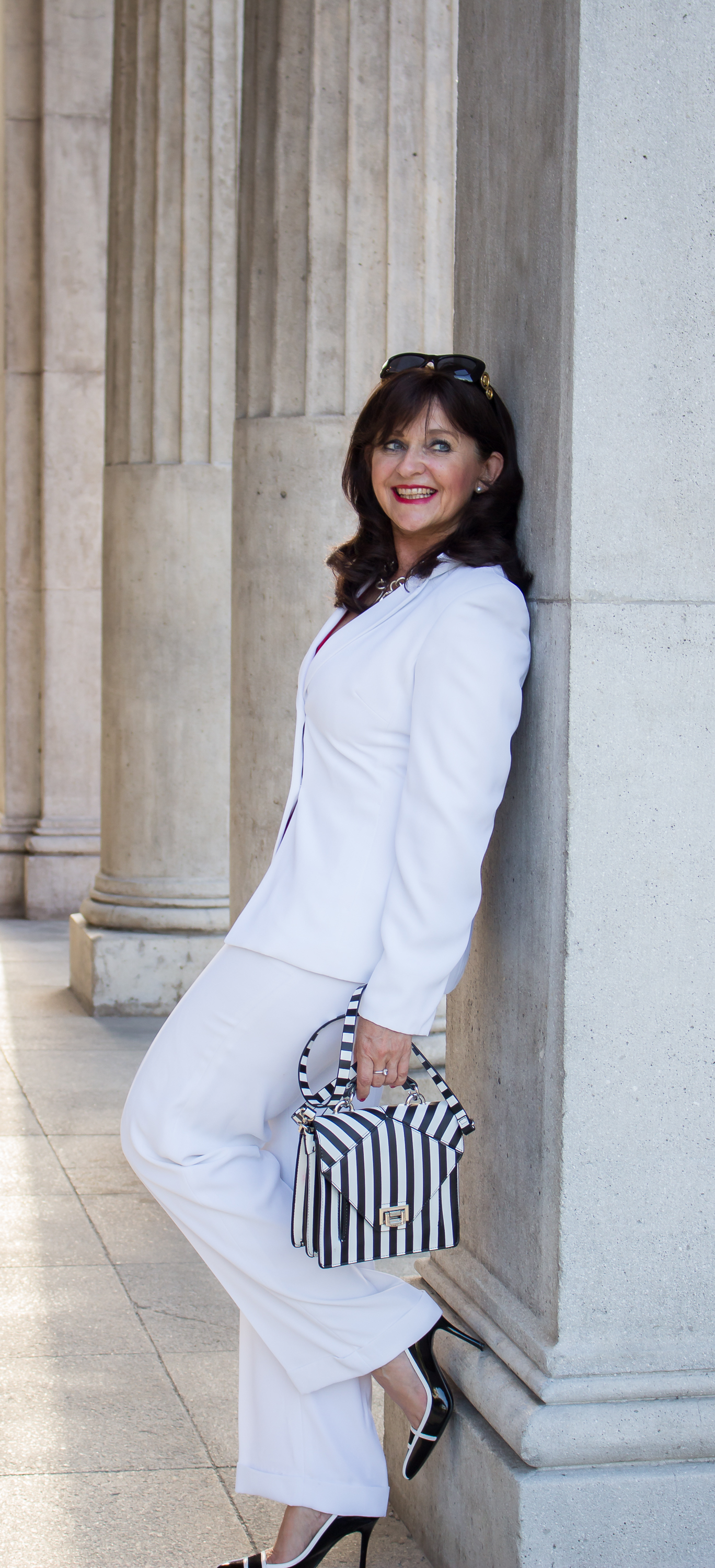 Meinen weißen Hosenanzug trage ich, wenn ich im Bayerischen Hof in die Komödie gehe. Die klassische Schnittführung des Blazers, die etwas weiter geschnittene Hose machen ihn zu meinem „Sommertraum“. Pfiffige Accesoires, wie Schuhe oder Handtasche, farbliche Tops oder Shirts geben dem ganzen Style den gewissen Pepp.