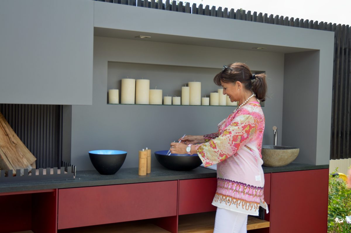In München sind die Küchen in vielen Wohnungen nicht einmal so groß wie die „Outdoor-Kitchen“ der Gartenschau in Pfaffenhofen a.d. Ilm. Ich tu mal so, als ob ich kochen könnte. Wobei, in dieser Küche würde es auch mir gefallen, mein Können unter Beweis zu stellen.