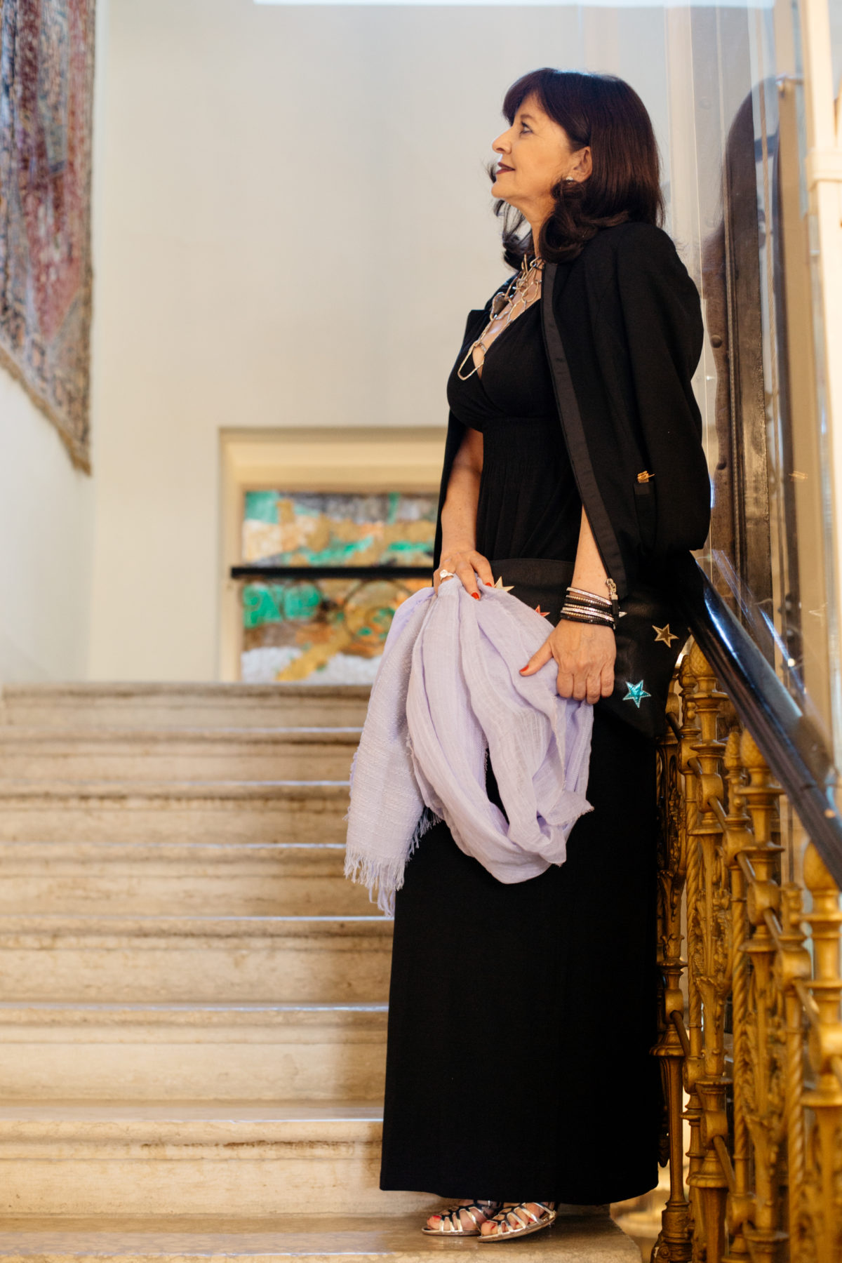 Erlaubt es die sommerliche Temperatur, dann trage ich ein leichtes Pashmina-Tuch als Jackenersatz. In manchen Restaurants ist es durch die Klimaanlage kühl. Mit einem leichten Tuch bleibt es angenehm im Schulterbereich.
