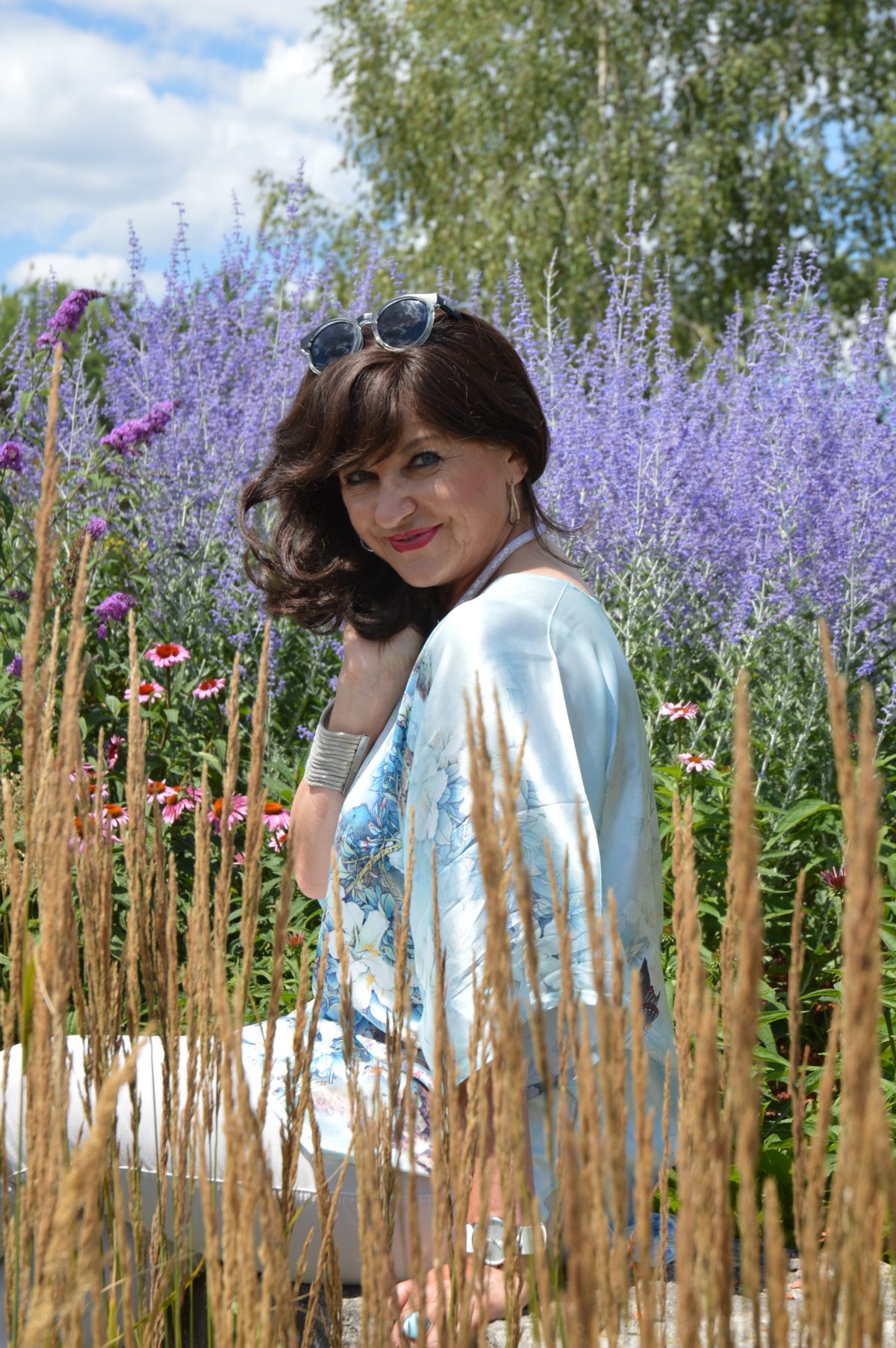 eine tolle Bluse hast Du Dir da wieder gegönnt, etwas ganz besonders mit wunderschönem Muster. Die Hose und die Schuhe sind natürlich auch klasse. Die Fotos sind sicher auf der Gartenschau aufgenommen worden, oder?