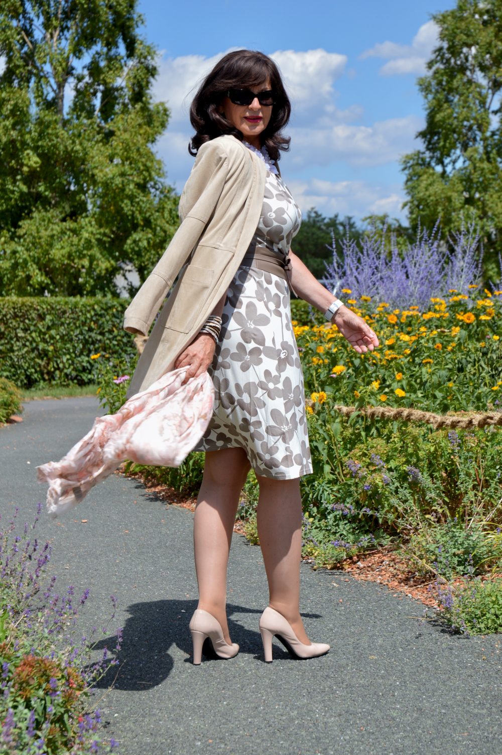 Mein tailliertes Jerseykleid ergänzt meine Sommergarderobe im Handumdrehen. Das zarte Blütenmuster und die unaufdringliche Farbigkeit setzen das Kleid und die Trägerin ins rechte Licht. Die Musterung ist in leichtem taupe und weiß gehalten. Nicht zu bunt und gleichzeitig feminin. Nicht, dass Du mich falsch verstehst, ich trage sehr gerne Buntes. Aber heute einfach eher reduziert.