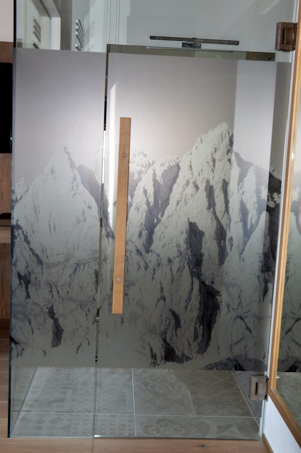 Das Badezimmer bietet einen Blick in die Bergregionen. Denn die Türen zum Badezimmer sind mit Berglandschaft-Motiven verziert. Was für eine geniale Idee.