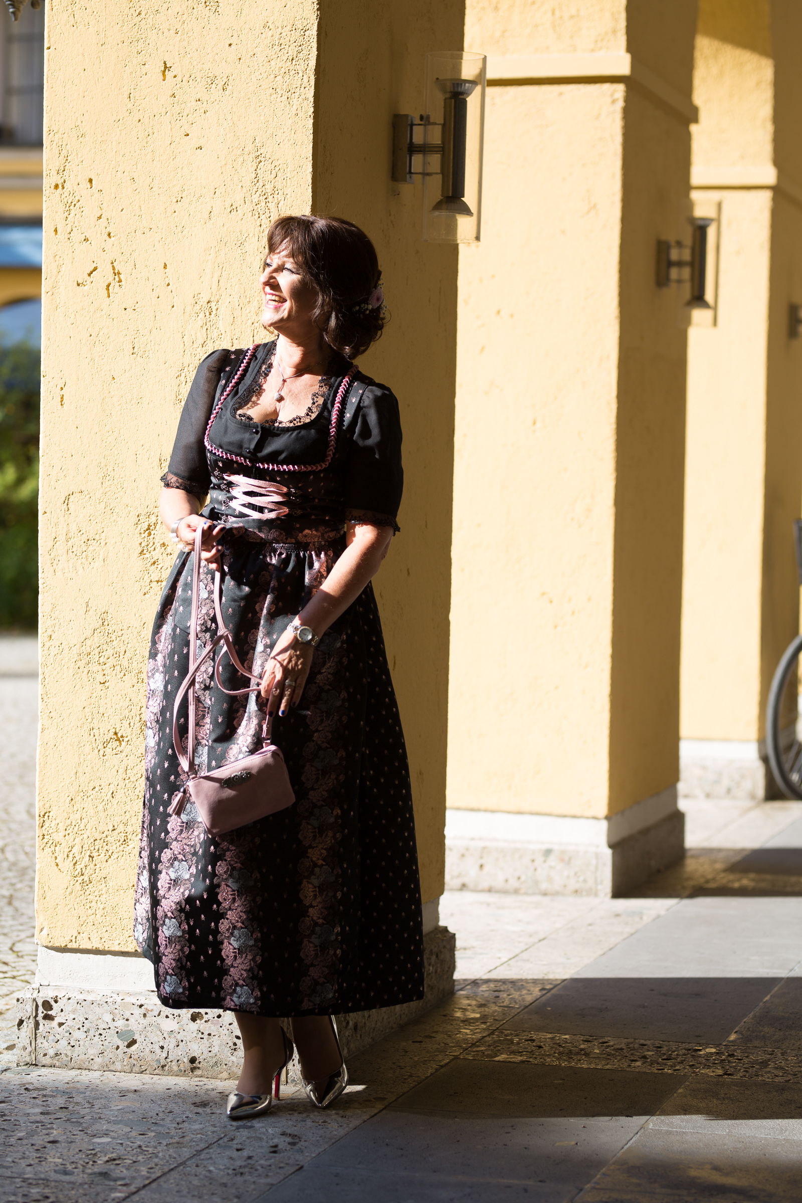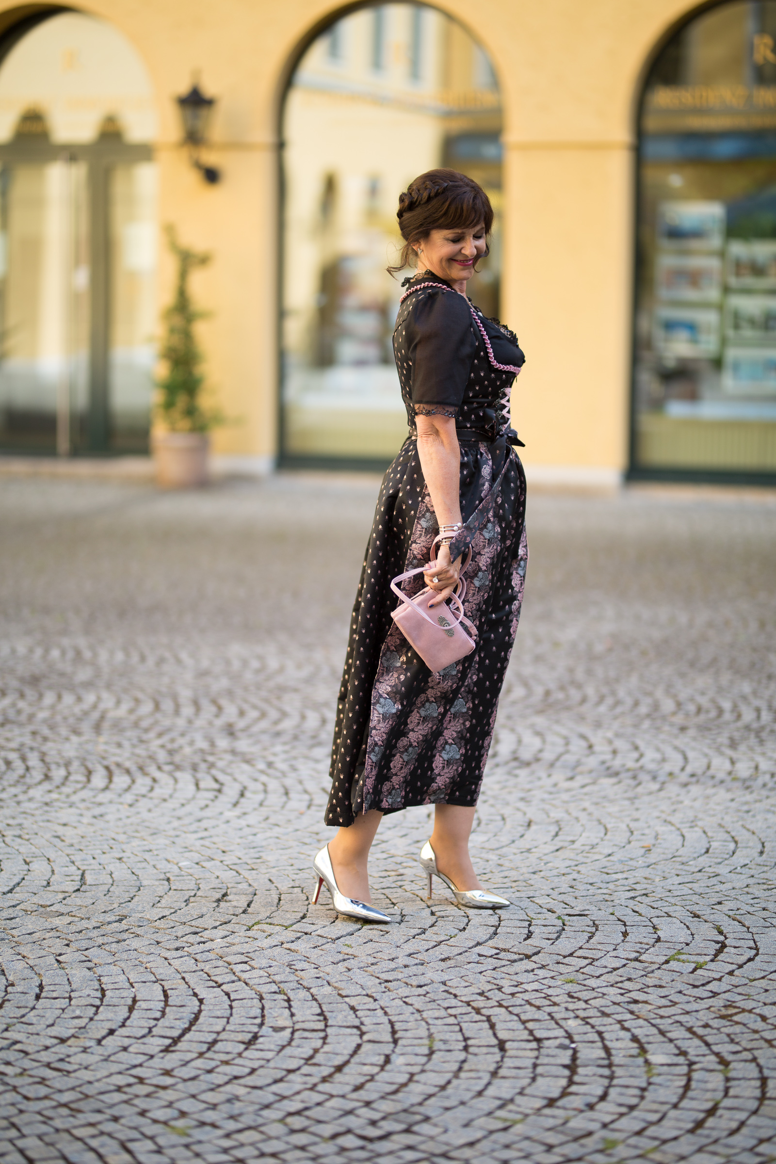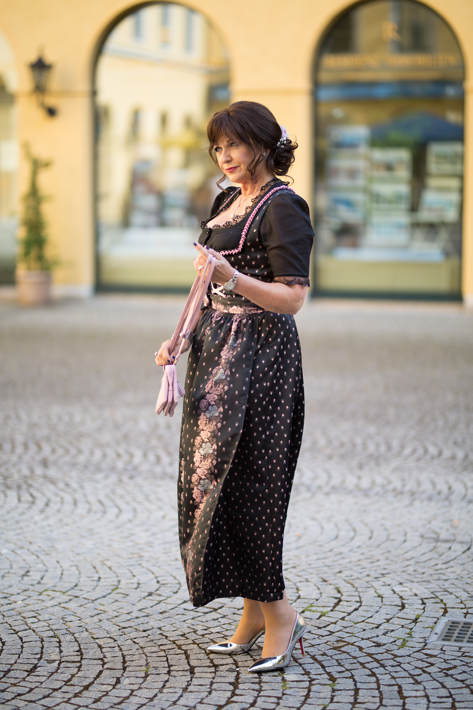 ein ganz bezauberndes Outfit hast Du da ausgewählt. Es ist sehr schade, dass dieses Dirndl nicht bei Dir eingezogen ist, denn ich finde es ganz toll. Perfekt in Szene gesetzt mit der rosafarbenen Tasche und den silbernen Schuhen, die Frisur mit den Blumen im Haar ist einzigartig dazu. Ich bin ein Fan von der schwarzen Stola dazu, aber die cremefarbene sieht natürlich auch toll dazu aus.