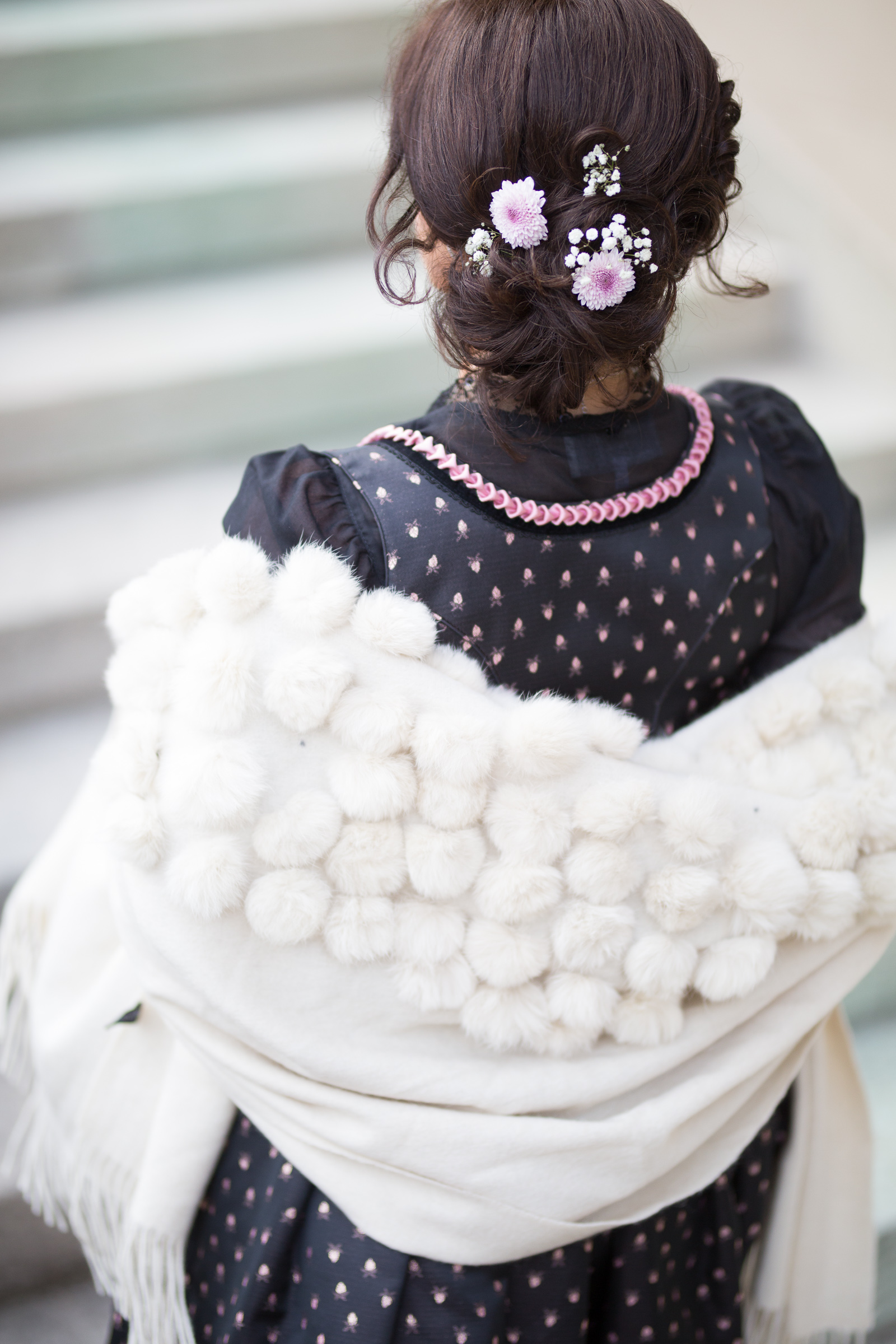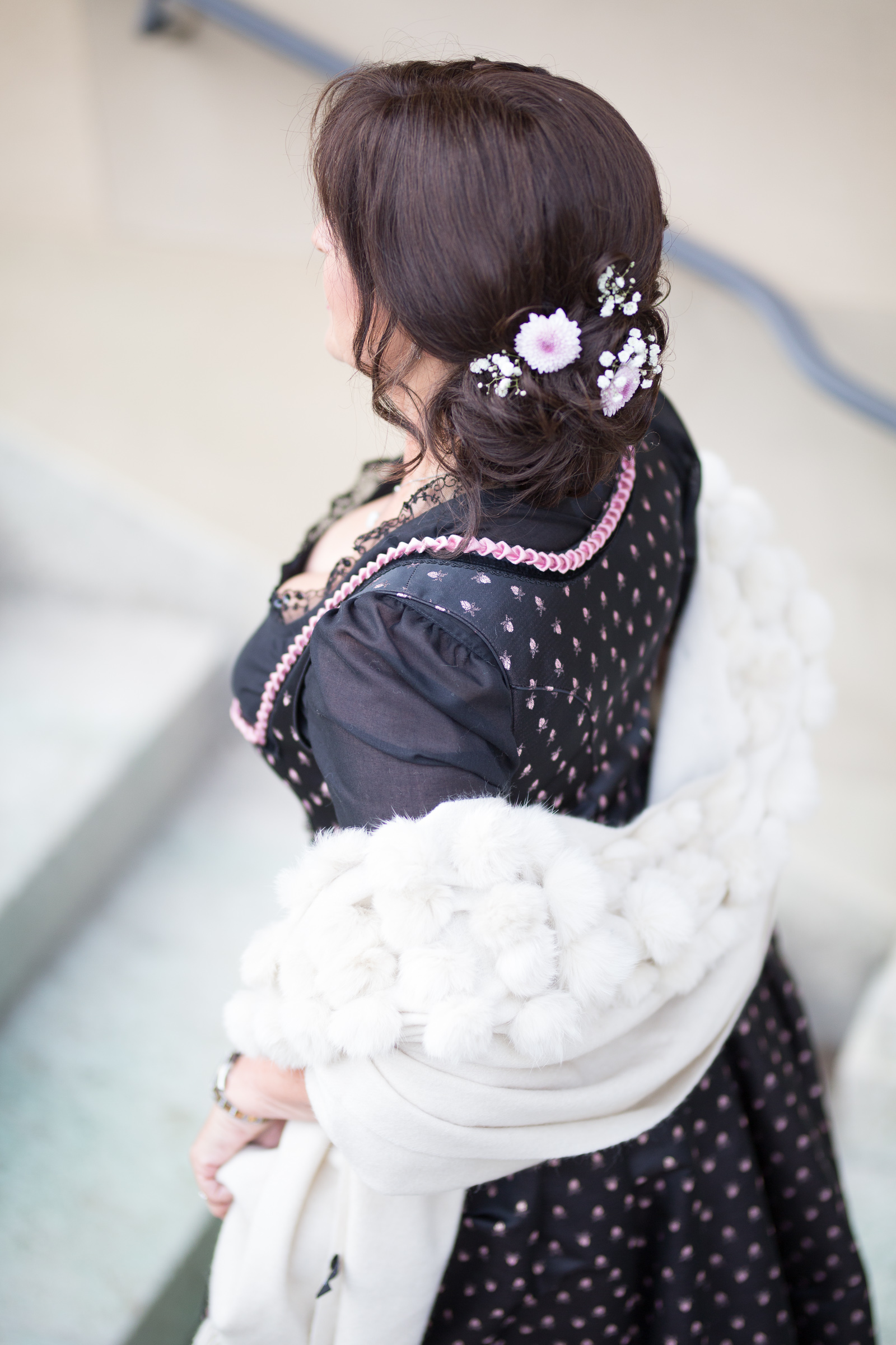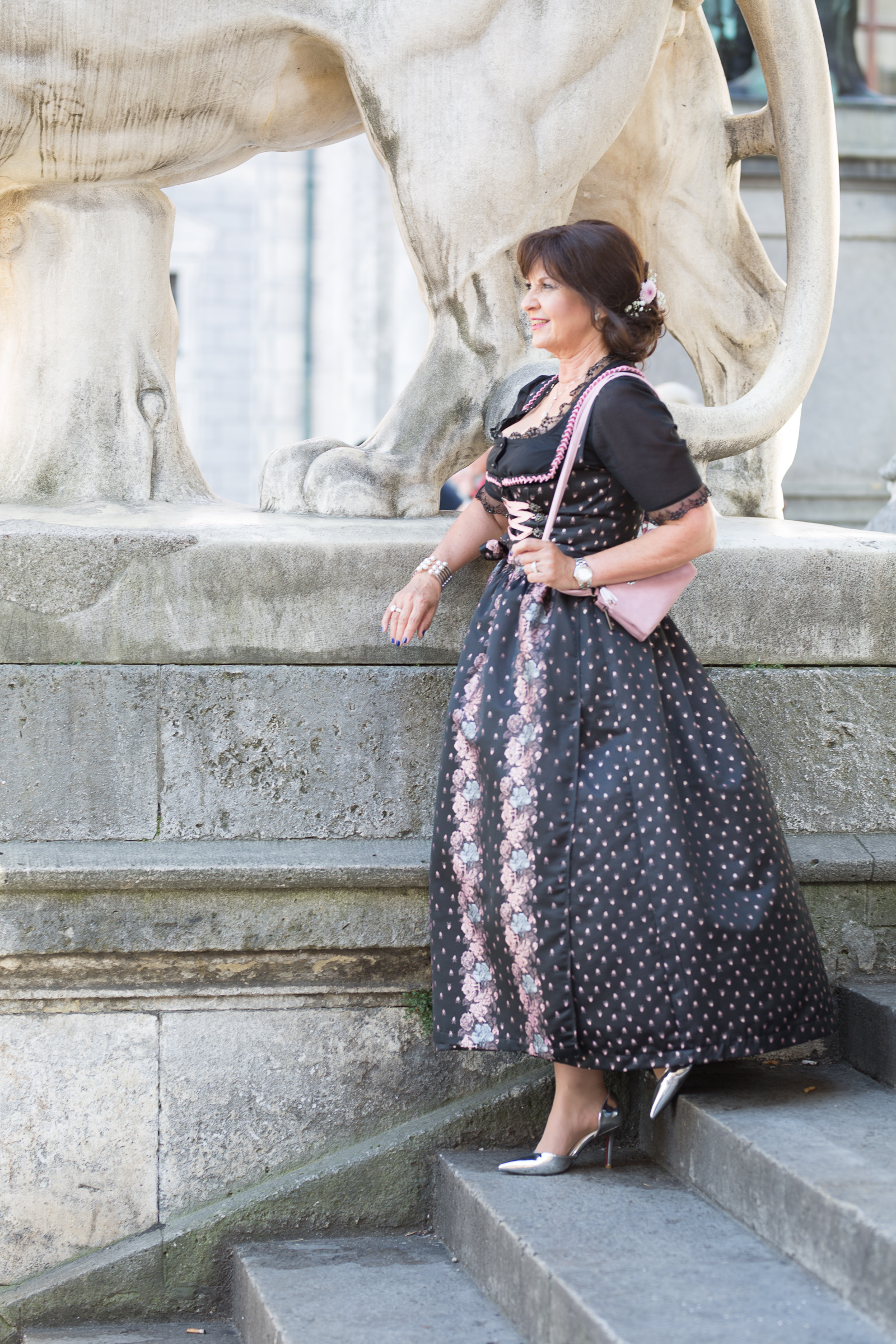 ein ganz bezauberndes Outfit hast Du da ausgewählt. Es ist sehr schade, dass dieses Dirndl nicht bei Dir eingezogen ist, denn ich finde es ganz toll. Perfekt in Szene gesetzt mit der rosafarbenen Tasche und den silbernen Schuhen, die Frisur mit den Blumen im Haar ist einzigartig dazu. Ich bin ein Fan von der schwarzen Stola dazu, aber die cremefarbene sieht natürlich auch toll dazu aus.