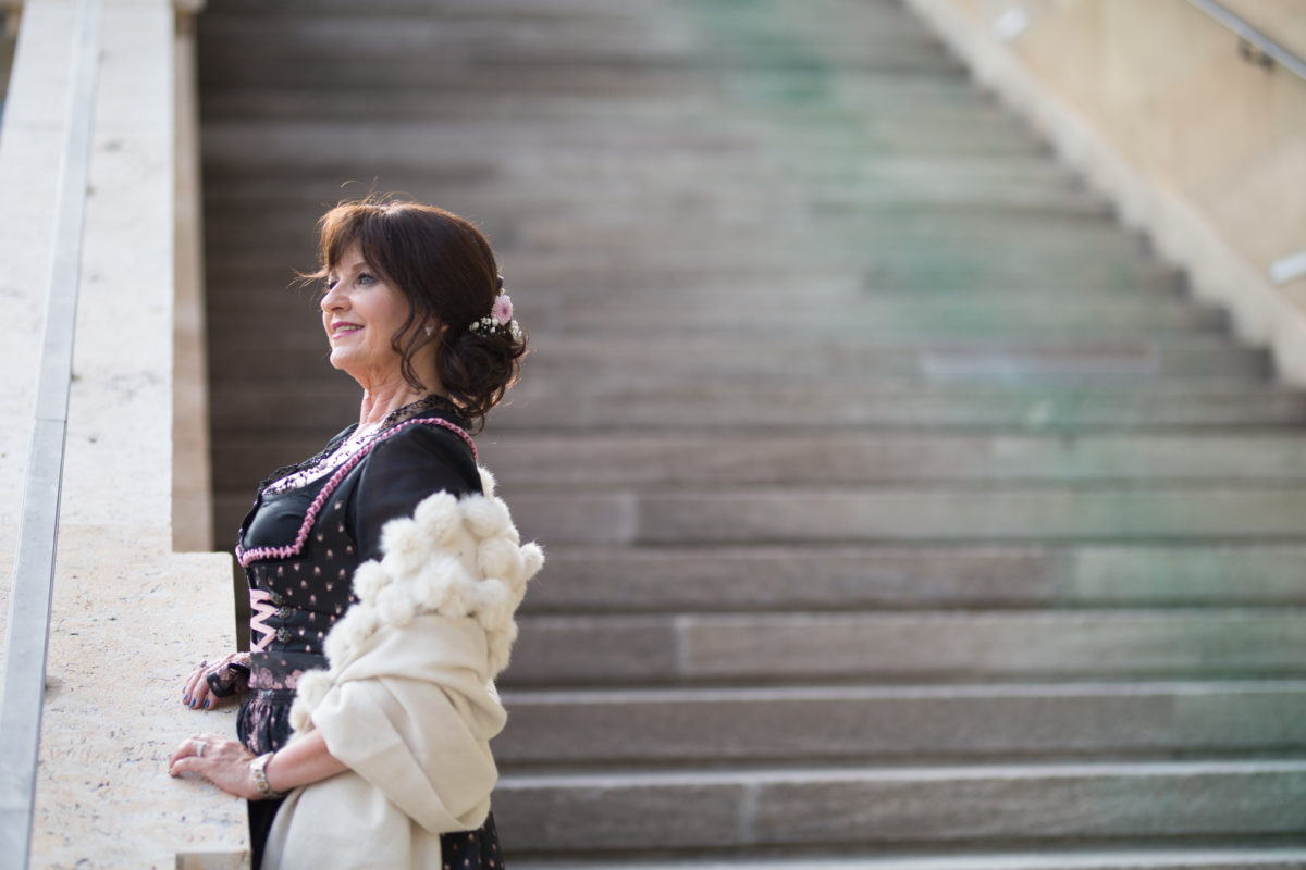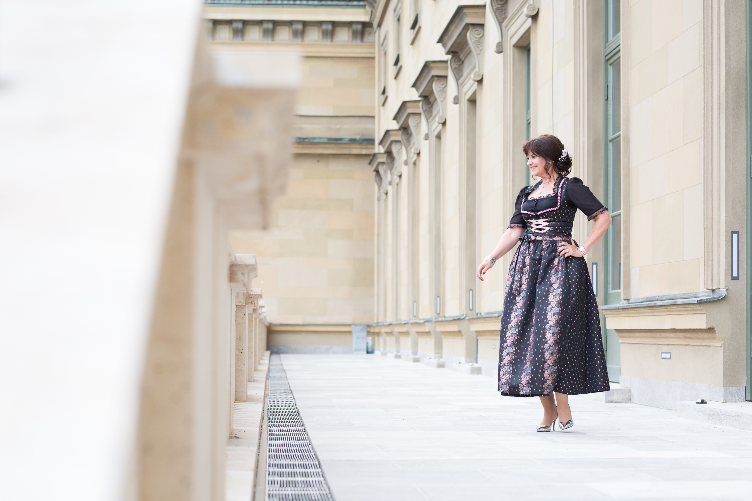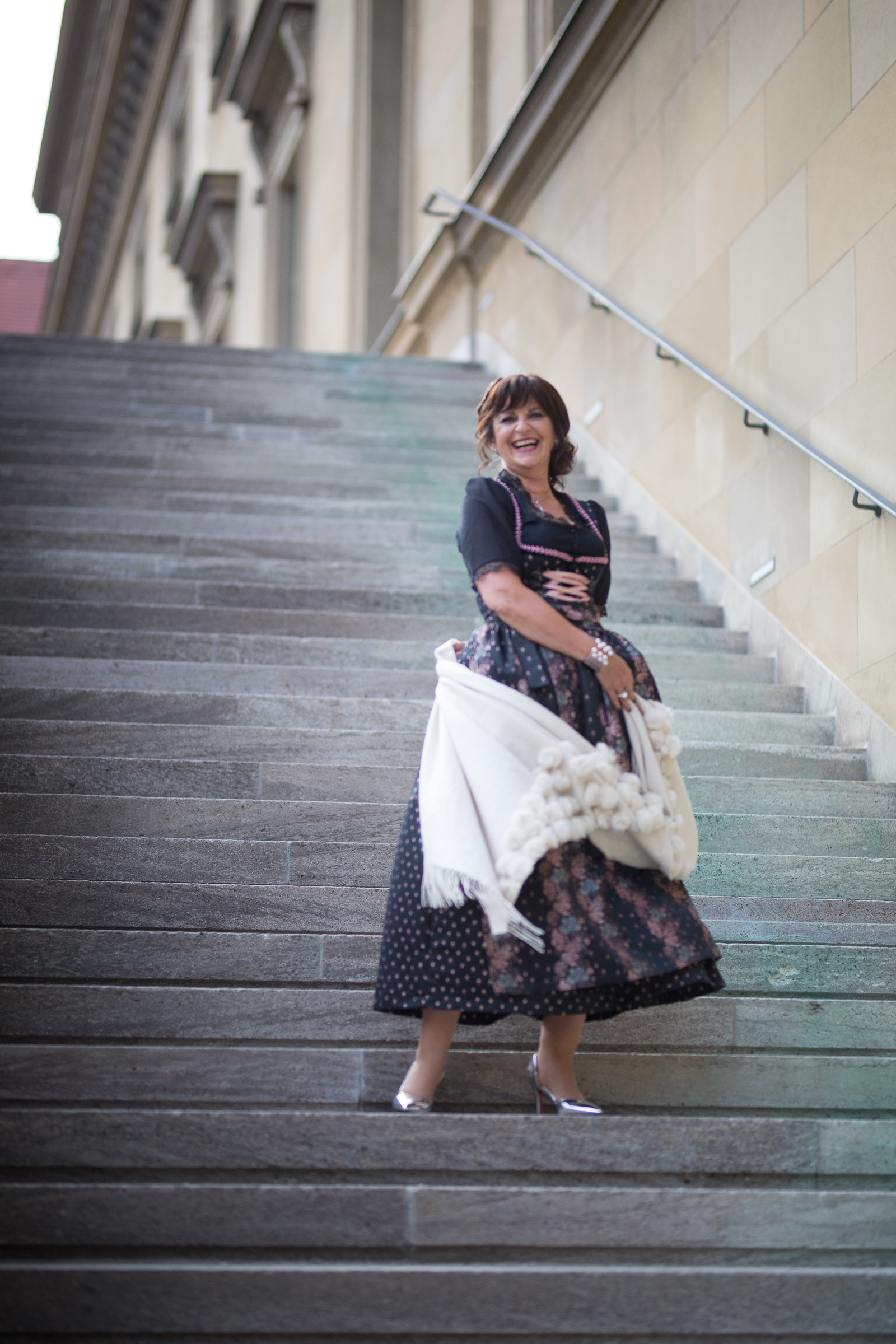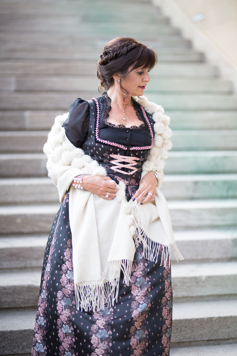 Du siehst ganz fantastisch aus! Das Dirndl, Tasche, Schuhe, sowohl die creme farbene als auch die schwarze Stola und die Frisur harmonieren einfach perfekt. Schön auch, dass es einen Dresscode gibt. Ich finde es schade, dass man heutzutage auch in Jeans ins Theater kommen kann.