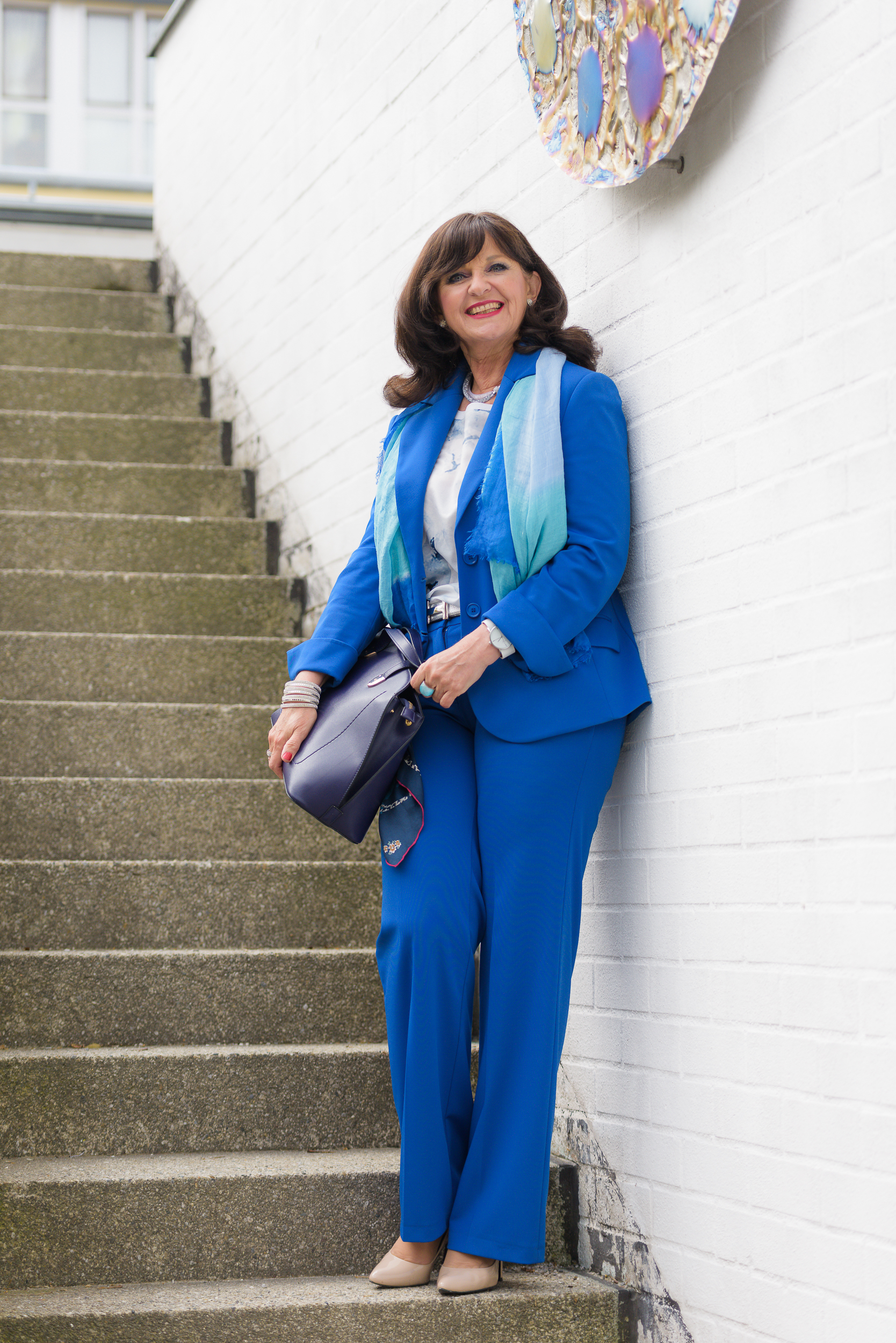 Ein Hosenanzug ist immer eine gute Wahl, das finde ich auch, da kann man so gut wie nichts falsch machen, wenn das „Darunter“ und die Accessoires auch stimmen. Das Blau ist eine tolle Farbe!
