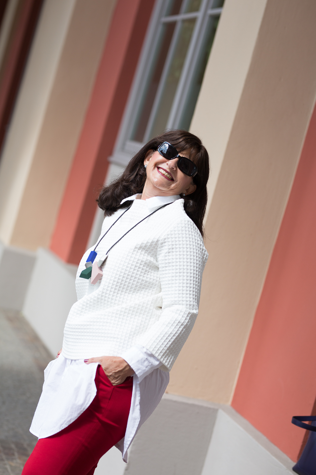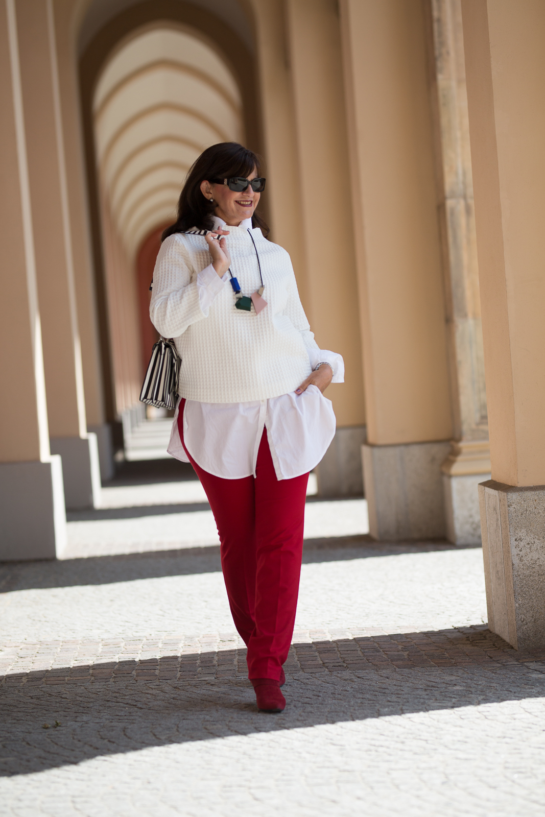 es muss ja nicht immer 1:1 umgesetzt werden. Anstatt einer roten Hose sieht eine schwarze, graue oder dunkelblaue ebenfalls gut aus. Der weiße Pulli ist ein Glücksgriff gewesen – vor kurzem hatte ich ihn zu einer Longbluse in schwarz kombiniert.