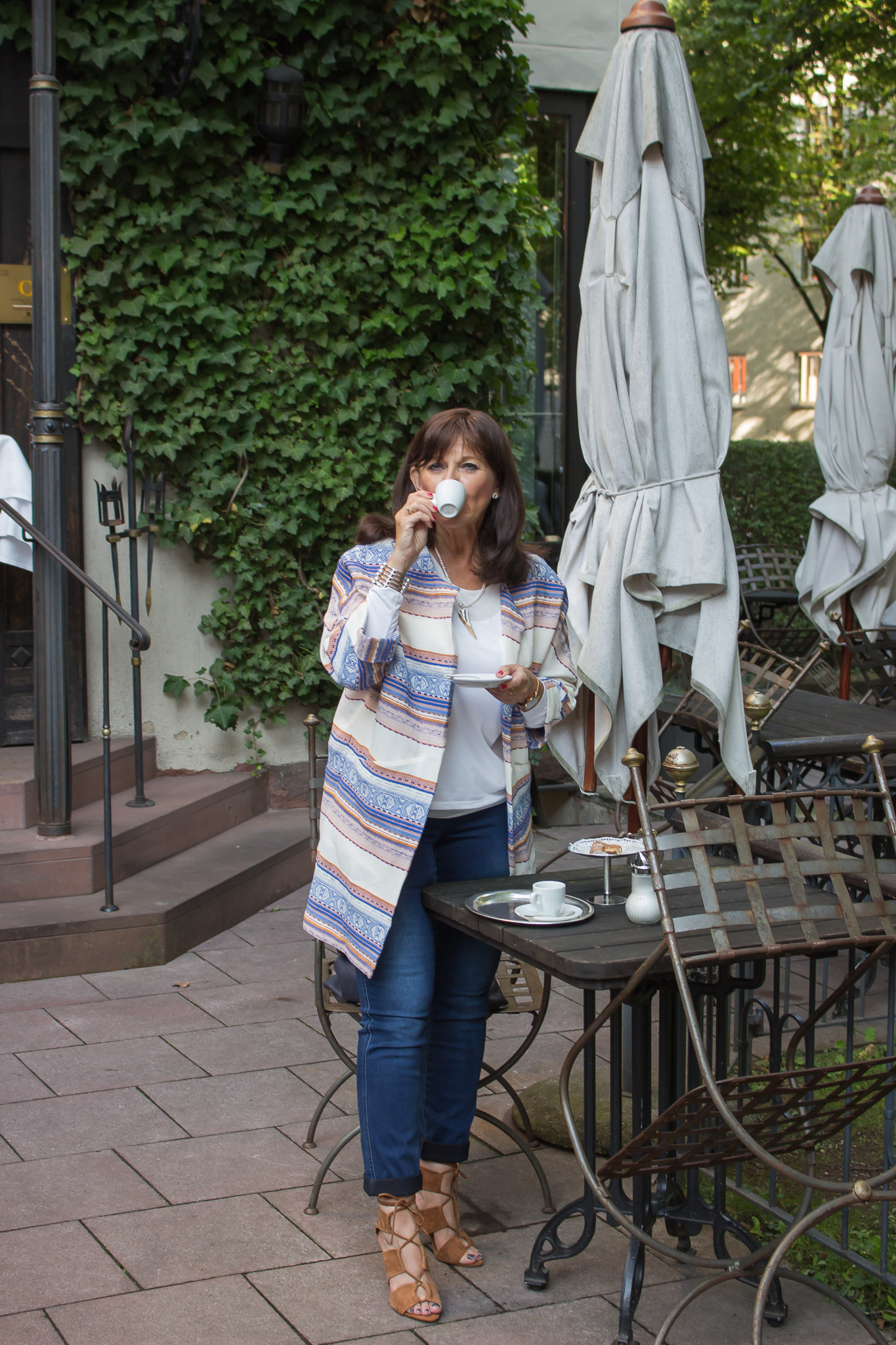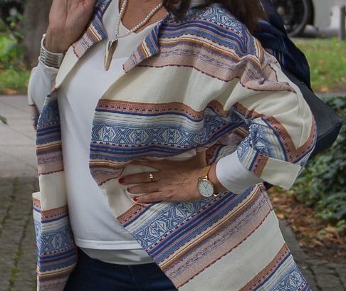 Meine bunte leichte Kimono-Jacke ist der Hingucker bei meinem Look. Diese wundervolle Jacke aus dem Hause Rich & Royal habe ich von einer meiner treuesten Leserinnen und inzwischen liebgewonnen Freundin geschenkt bekommen. Ich bin total verliebt in diese edle Jacke im Ethno Look.