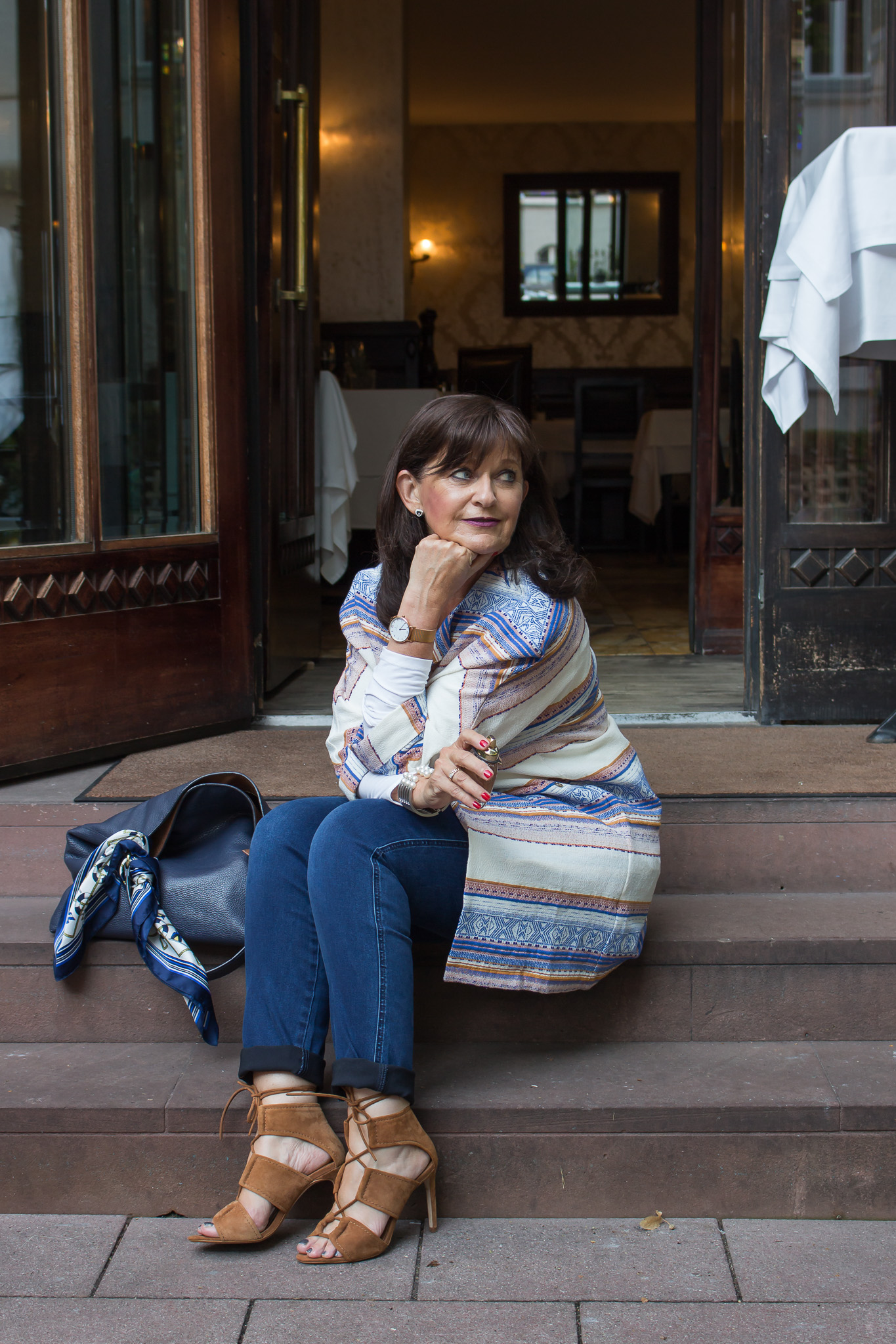 Meine bunte leichte Kimono-Jacke ist der Hingucker bei meinem Look. Diese wundervolle Jacke aus dem Hause Rich & Royal habe ich von einer meiner treuesten Leserinnen und inzwischen liebgewonnen Freundin geschenkt bekommen. Ich bin total verliebt in diese edle Jacke im Ethno Look.