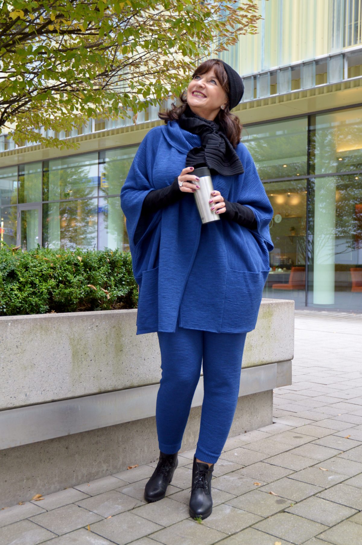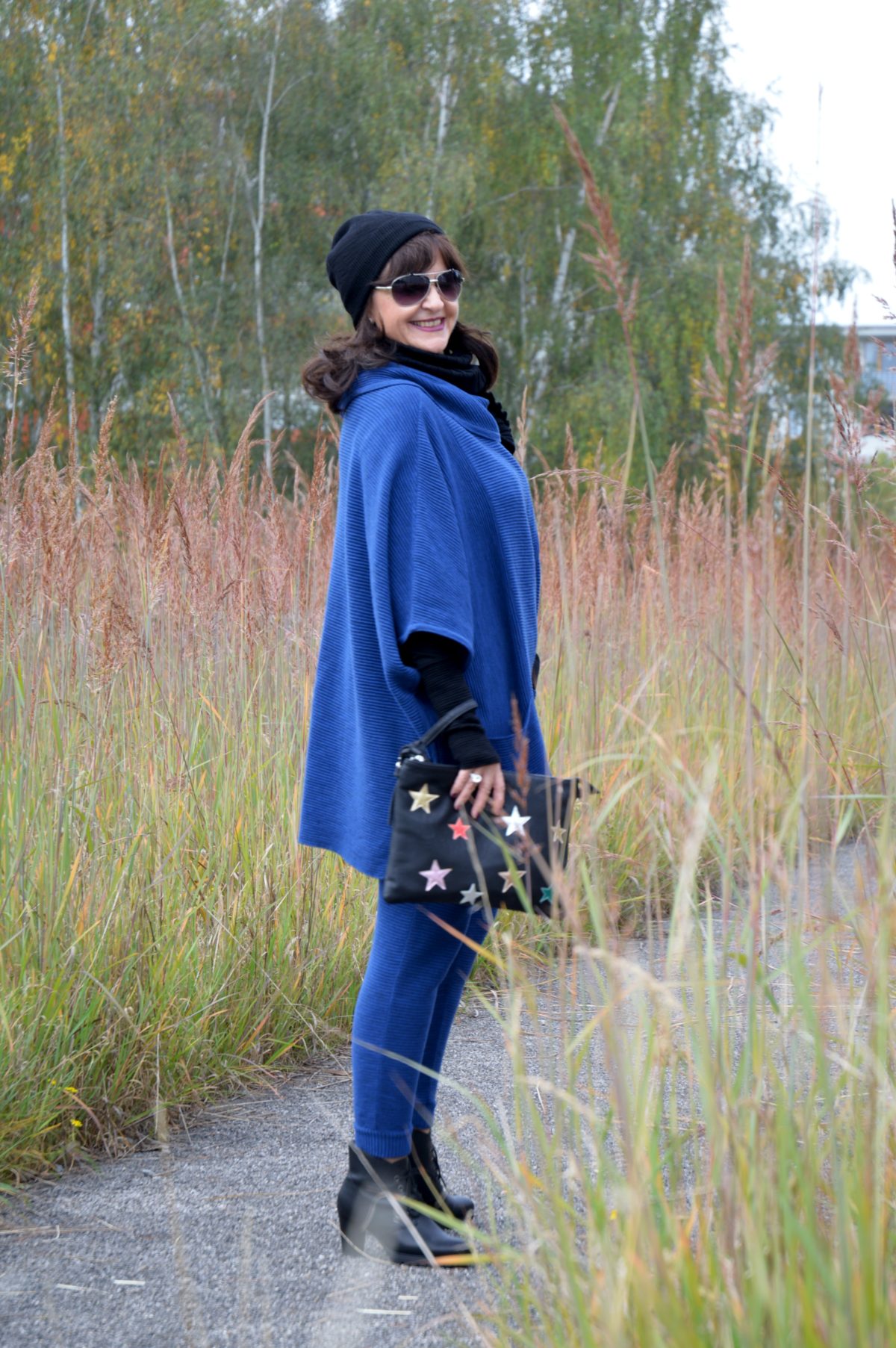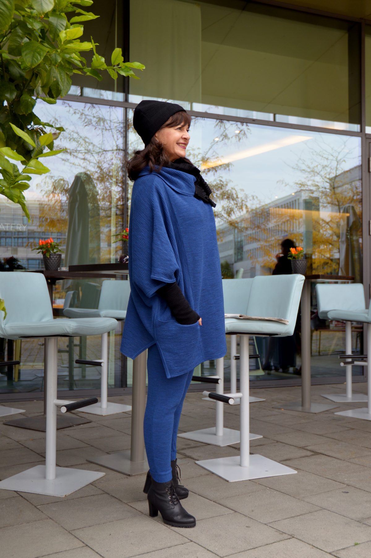 Royalblauer Poncho, royalblauer Hose – ist für farbmutige Ladies die beste Wahl. Dazu kombiniere ich schwarze Stulpen, einen schwarzen kuscheligen Schal und eine leichte Mütze. Alles ist perfekt aufeinander abgestimmt. Die Leichtigkeit des Materials begeistern mich ganz besonders.