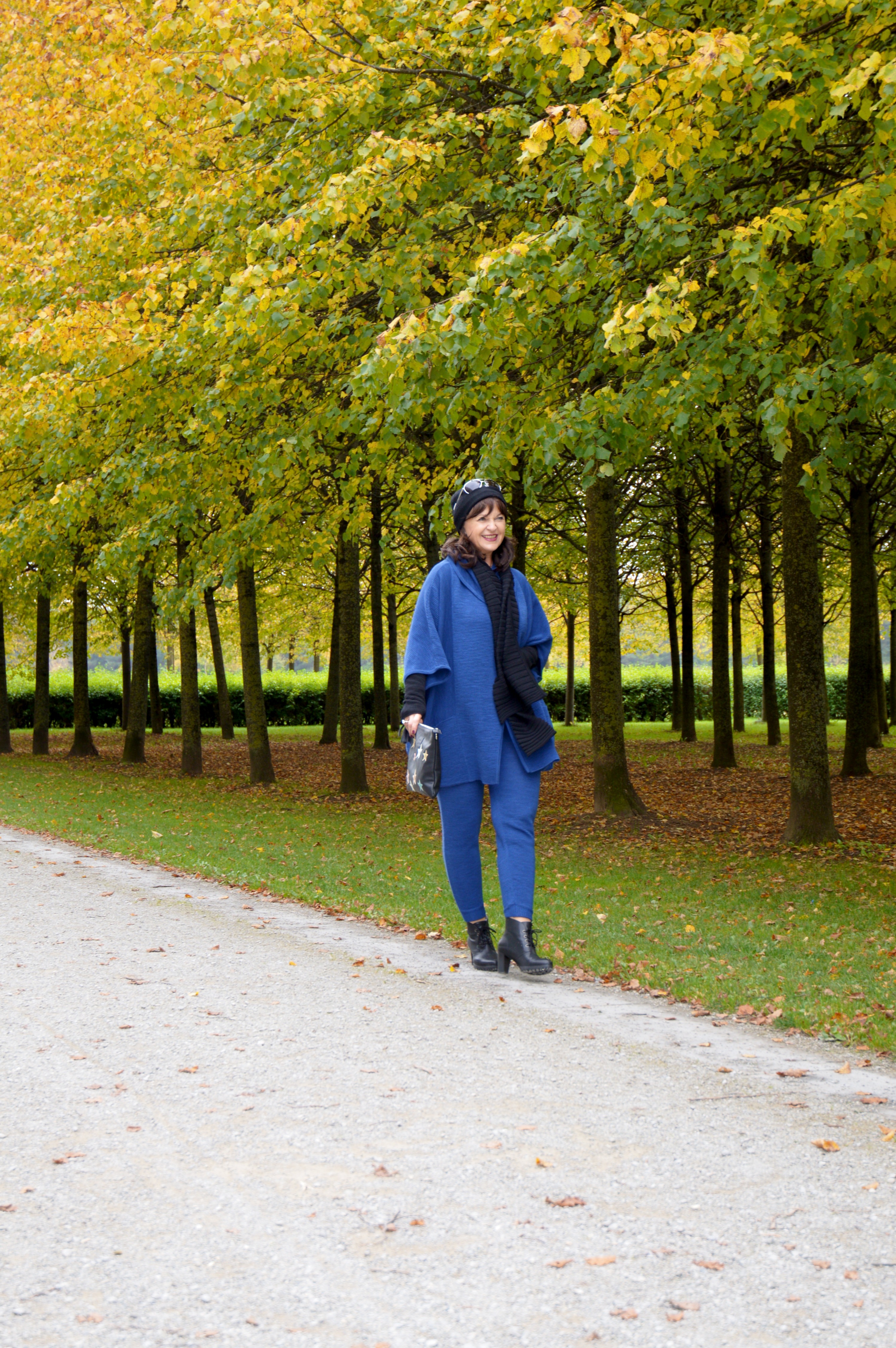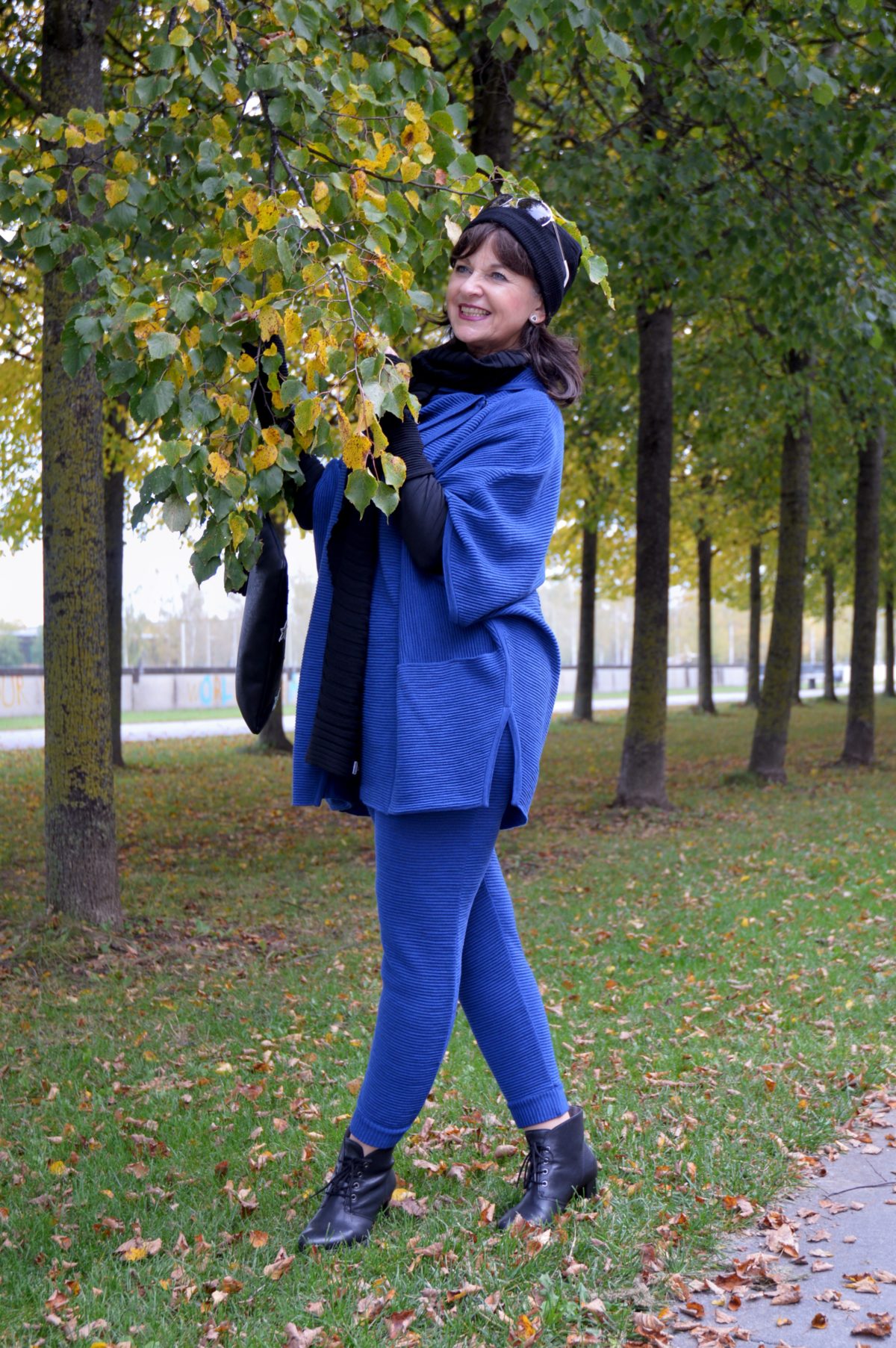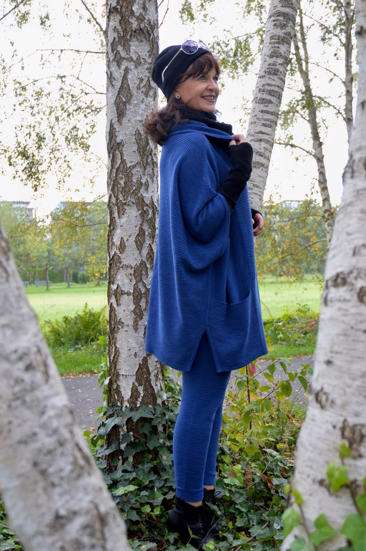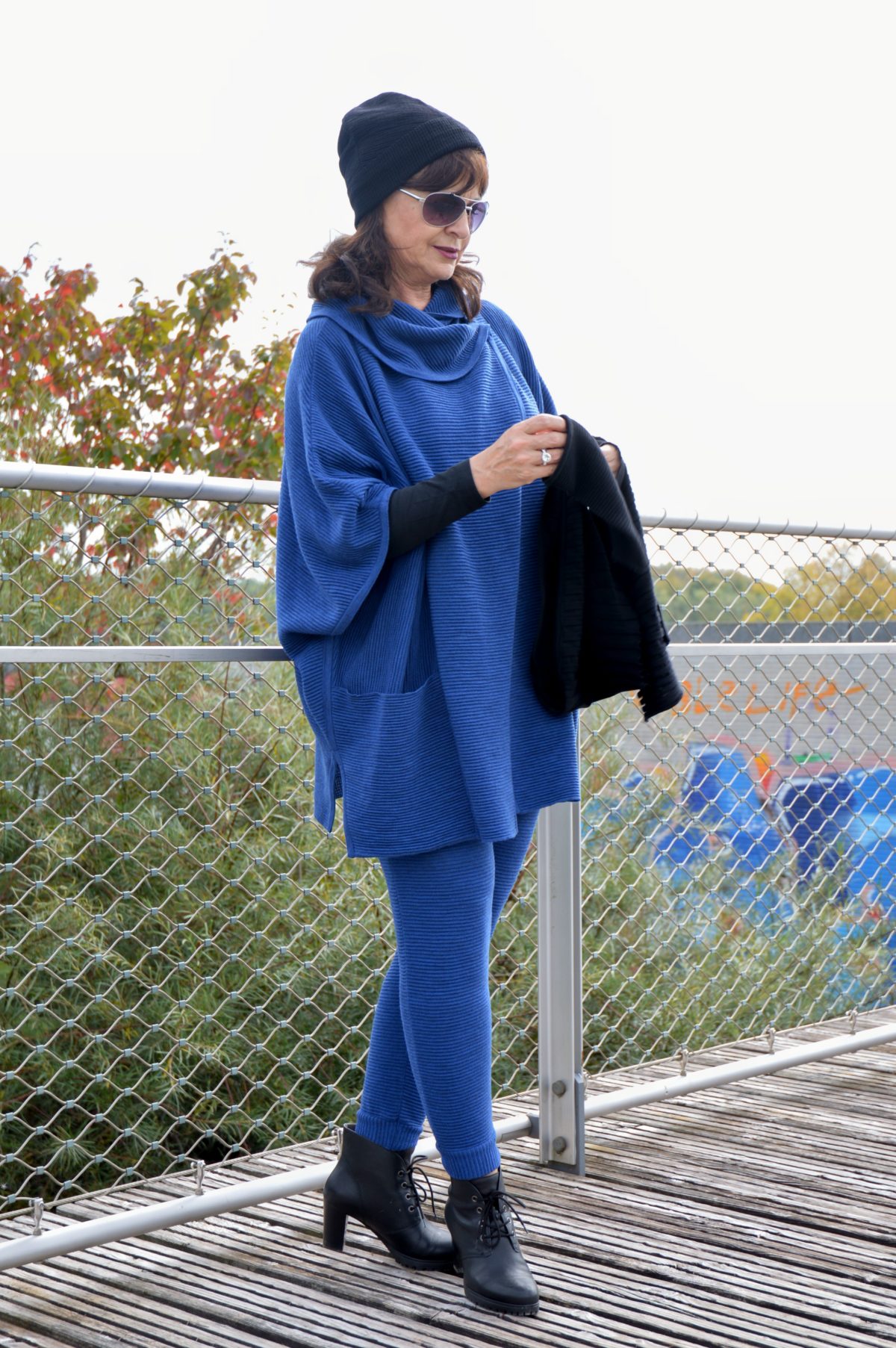 Royalblauer Poncho, royalblauer Hose – ist für farbmutige Ladies die beste Wahl. Dazu kombiniere ich schwarze Stulpen, einen schwarzen kuscheligen Schal und eine leichte Mütze. Alles ist perfekt aufeinander abgestimmt. Die Leichtigkeit des Materials begeistern mich ganz besonders.