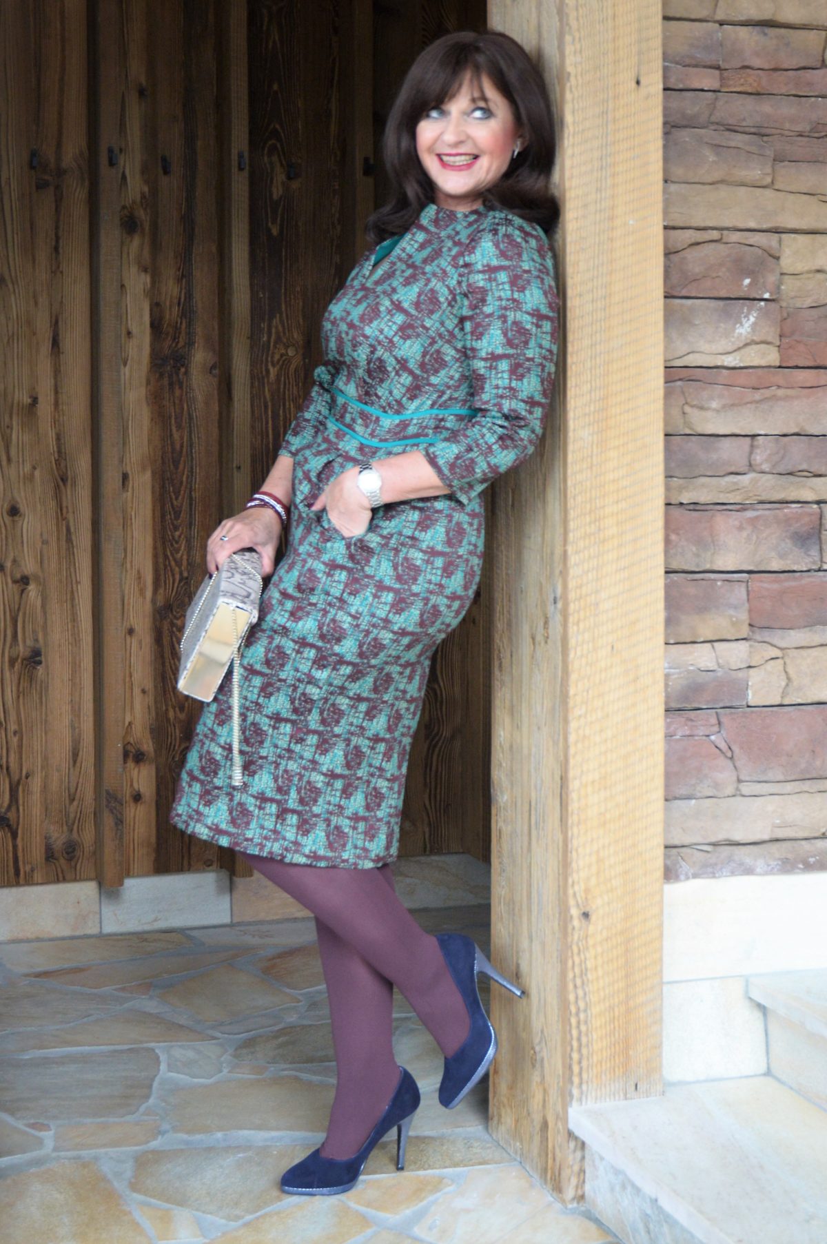 ausgefallene Muster, gewagt mit farbigem Strumpf und Pumps – aber es harmoniert ja alles miteinander.