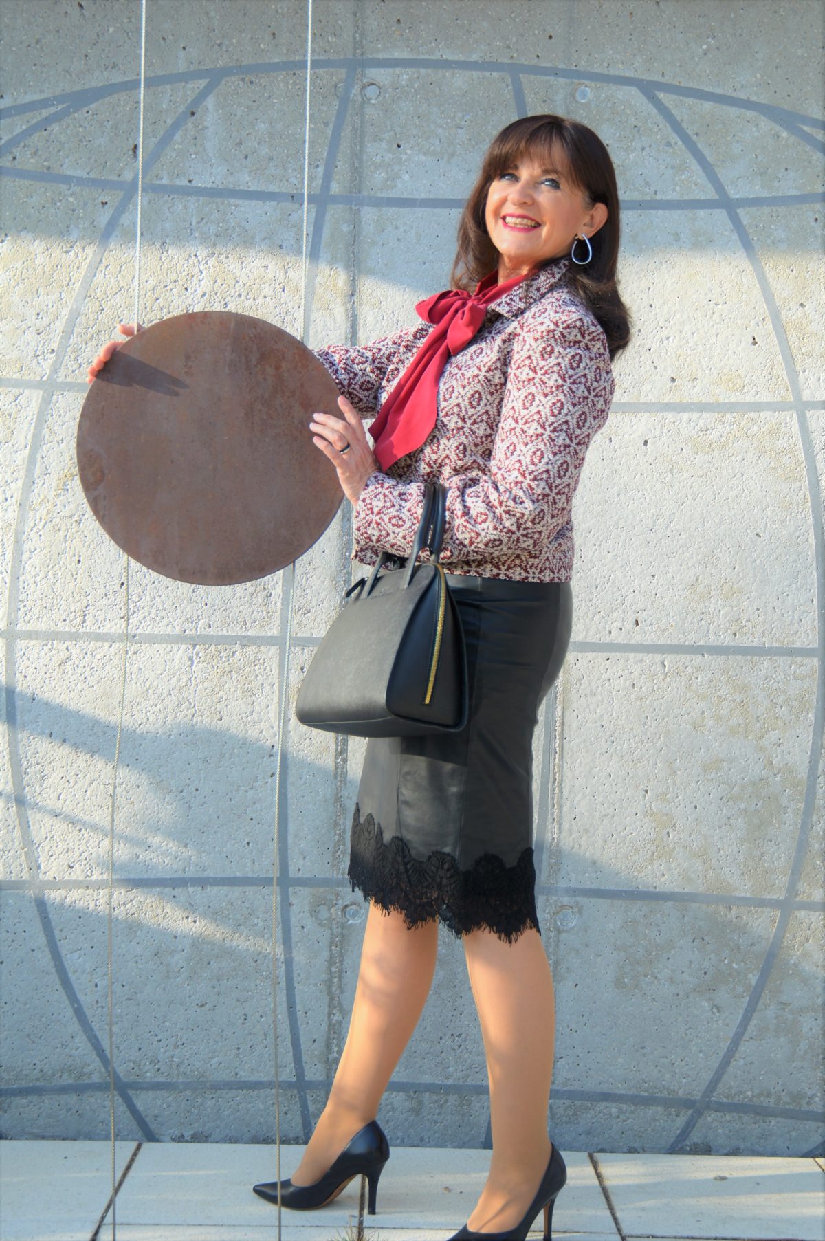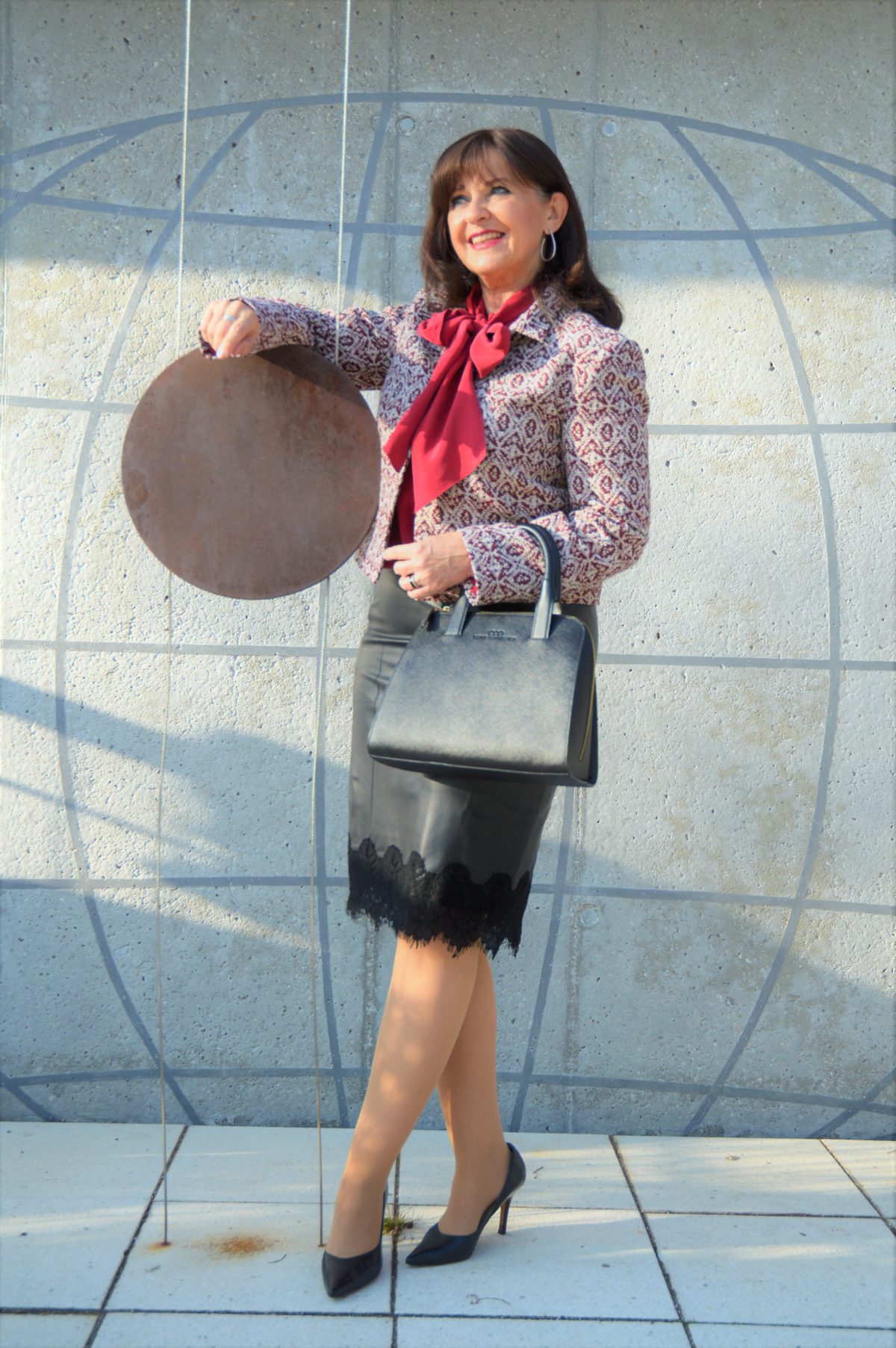 Ganz schick was du uns hier präsentierst. Rot u schwarz eine tolle Kombi. Der lederrock ist ja mal wieder etwas besonderes. Die rote schluppenbluse ist wunderschön. Mit der Jacke dazu – ganz flott.